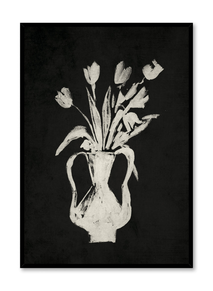 This elegant, monochromatic still life features a vase of stylized flowers, rendered in soft, muted shades of cream and black.