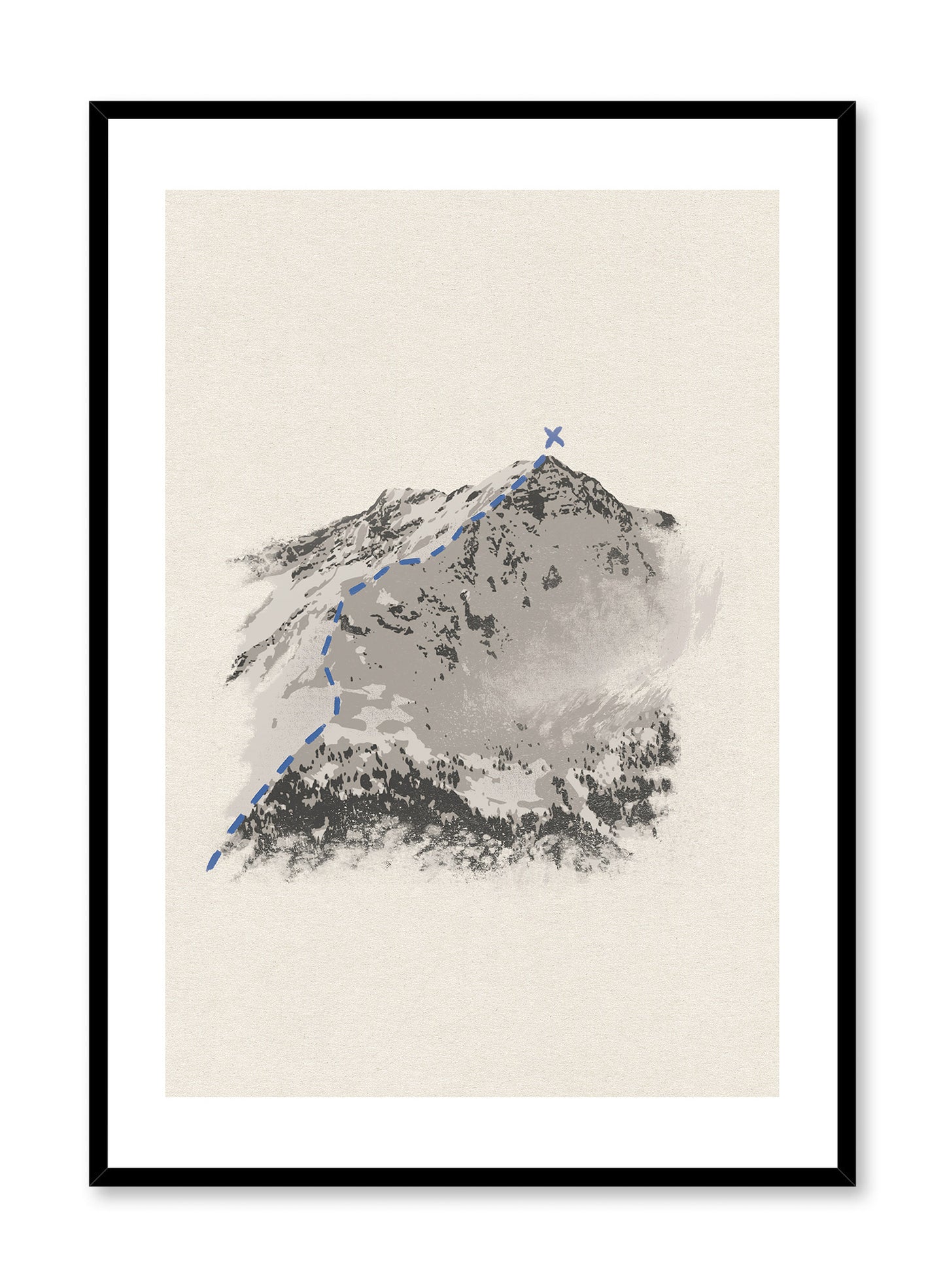 The best part of getting 'All the Way to the Top'? Skiing all the way down! This minimalist illustration shows a snowy black and white mountain summit with a dotted blue line and an 'x' marking the highest altitude.