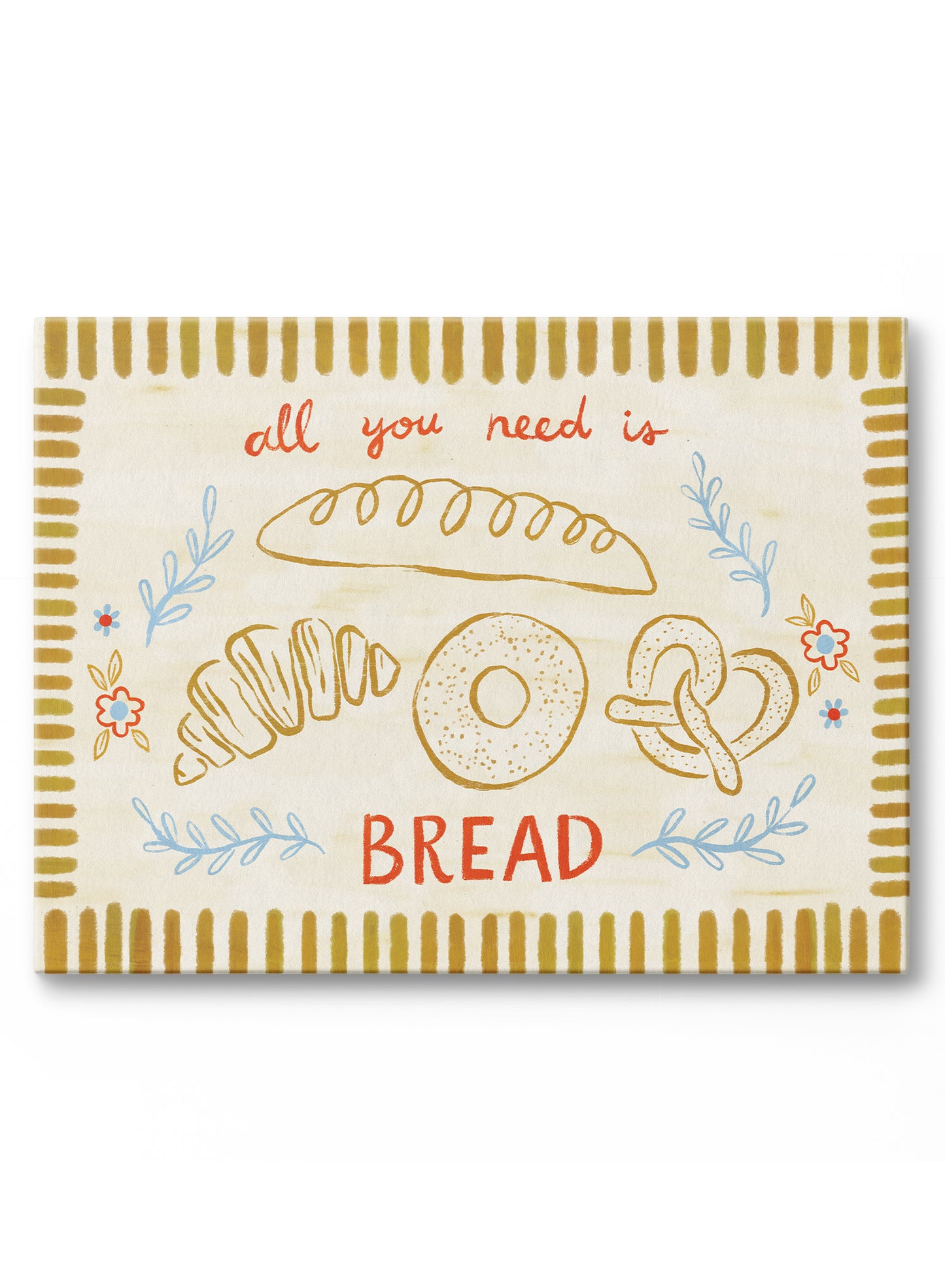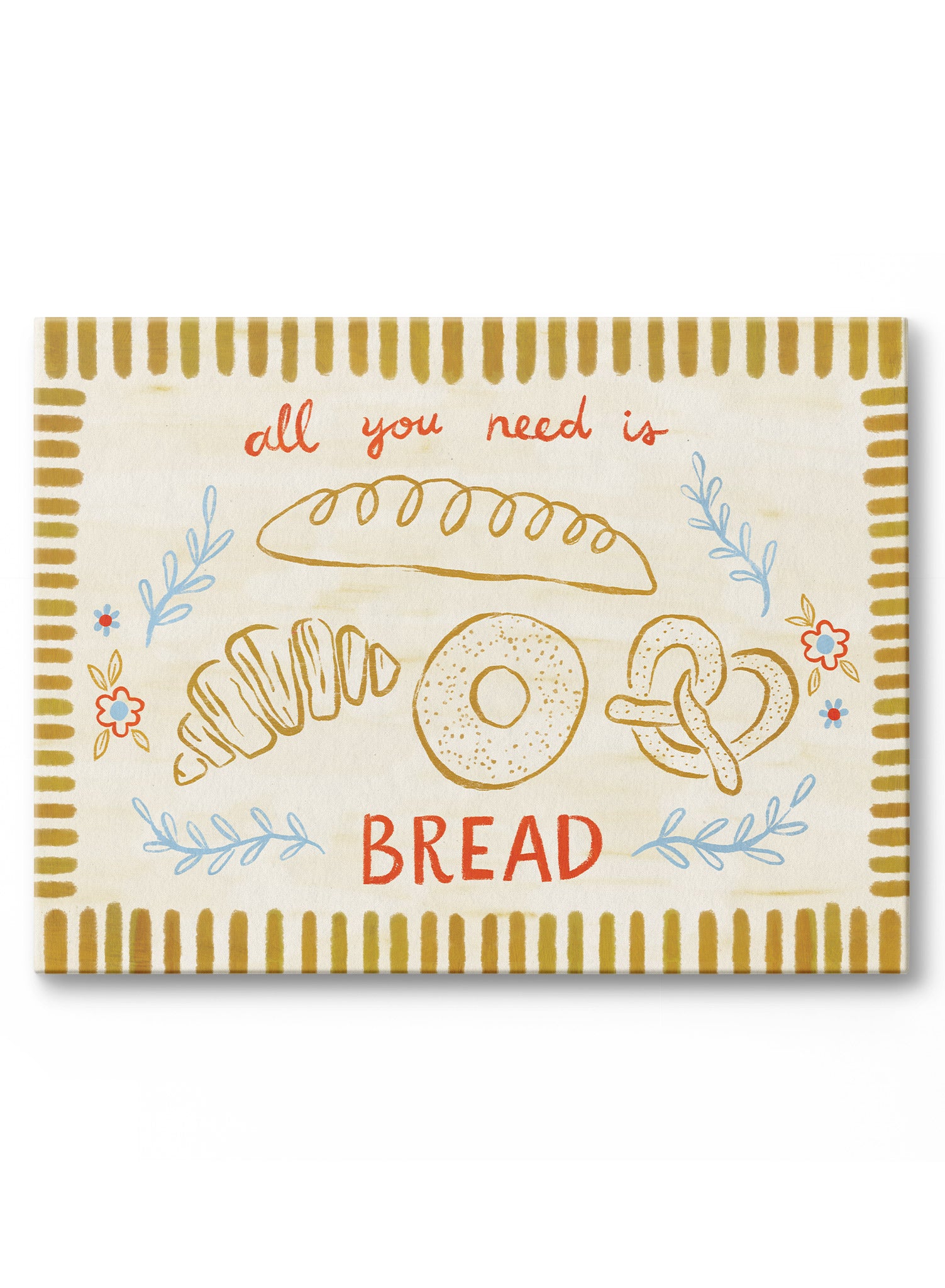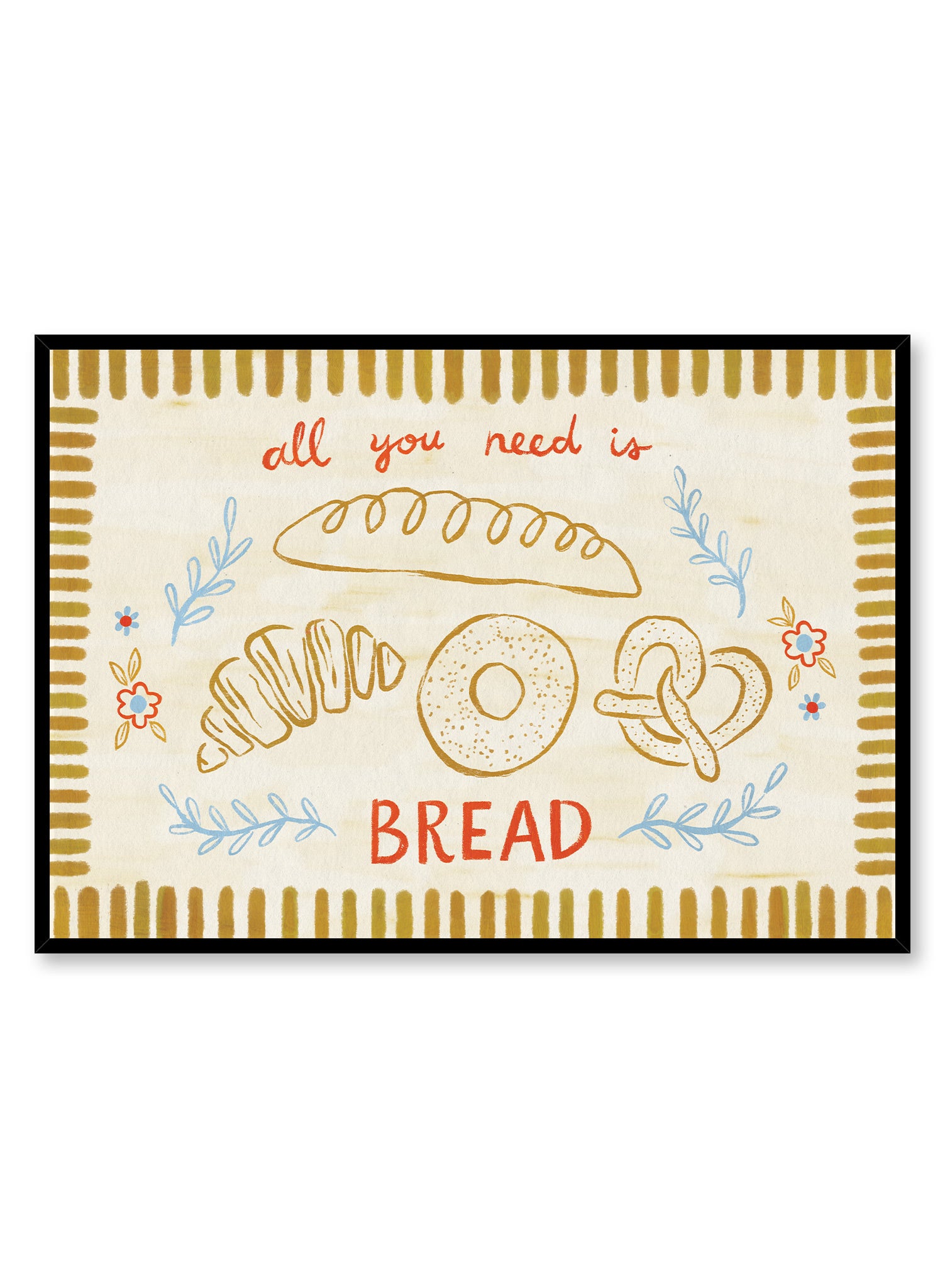 Buttery breads take center stage in this warm-hearted piece by Kenzie Elston. A lineup of beloved carbs—baguette, bagel, pretzel, croissant—sits beneath hand-lettered text reading 'all you need is BREAD', surrounded by simple floral sprigs and a golden striped border.