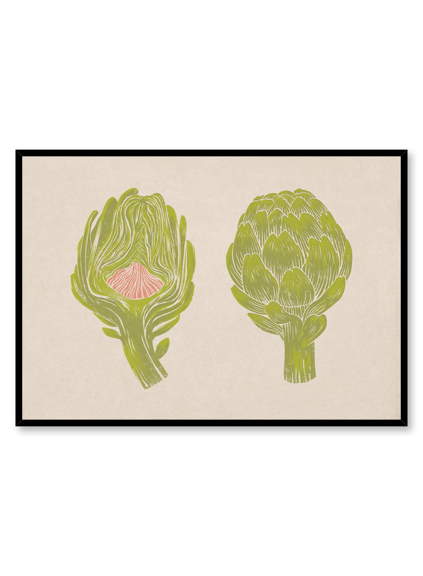 This print celebrates the natural beauty of artichokes with two striking illustrations—one whole, the other sliced open to reveal its intricate layers and soft pink heart. The fine white linework highlights the vegetable’s sculptural quality, giving it a hand-etched, vintage feel.