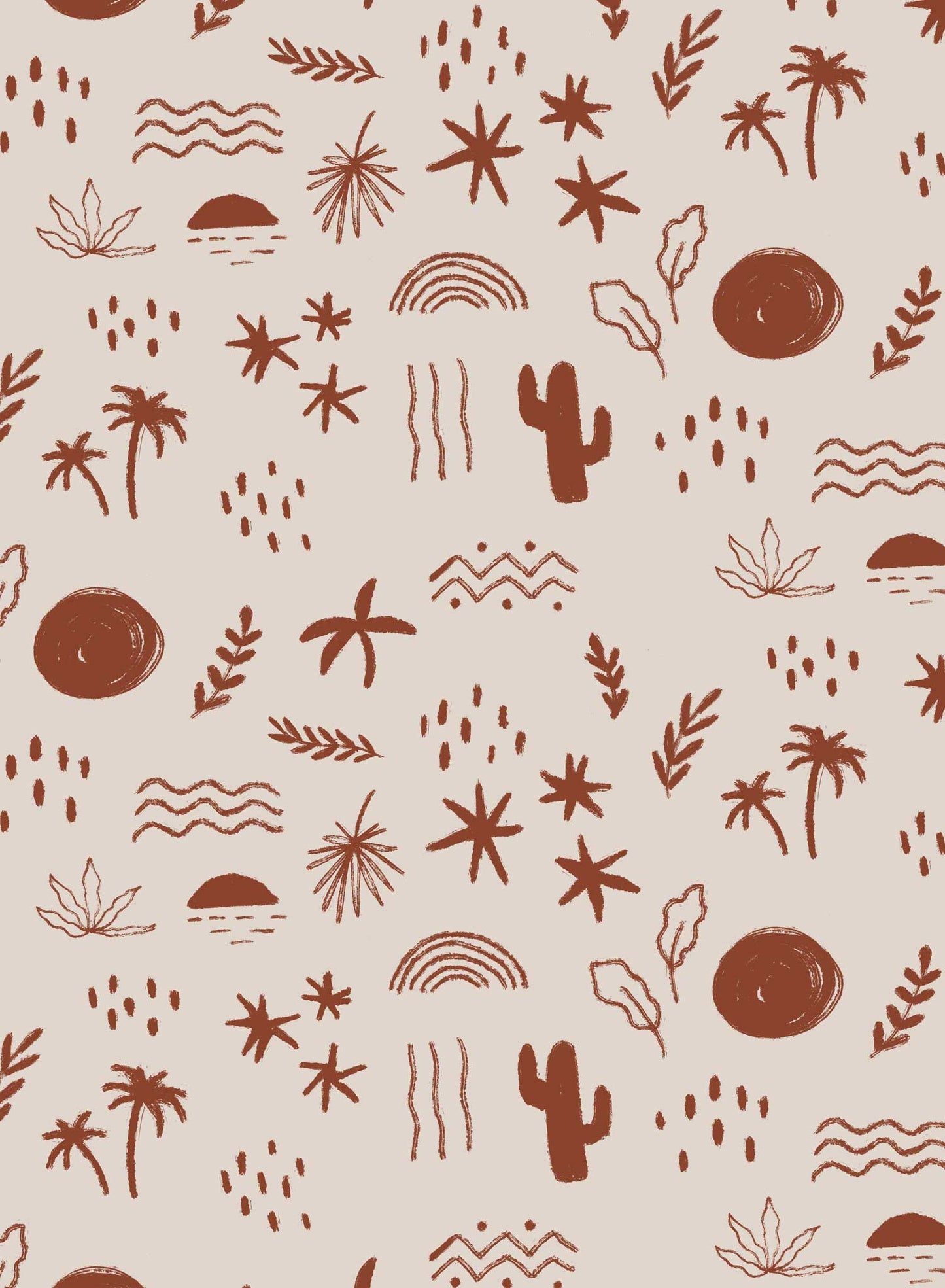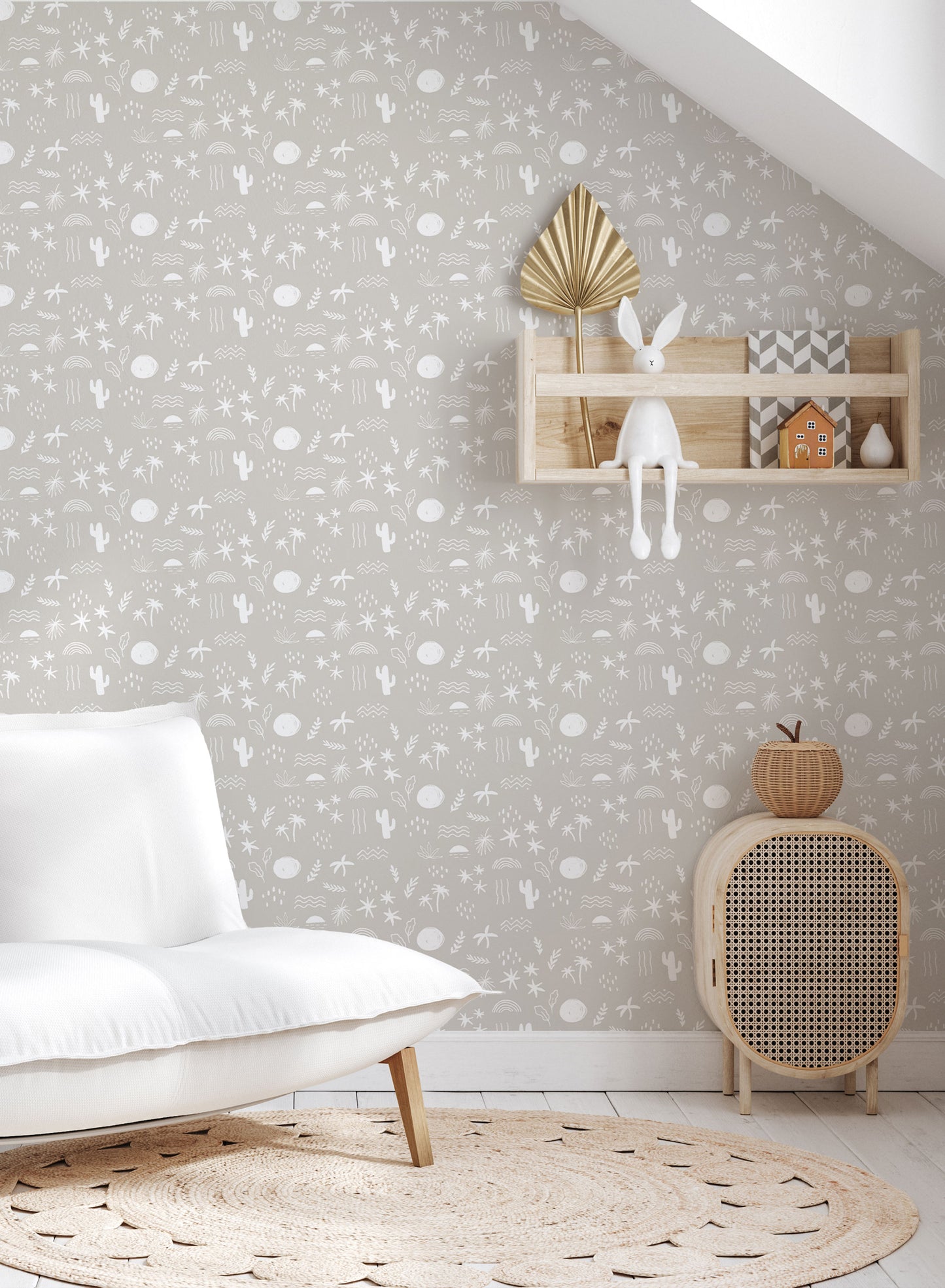 Give your walls a glow up with the ‘Aruba’ wallpaper design. This fun bohemian pattern features minimalistic waves, rainbows, leaves, and cacti. This tropical boho wallpaper is available in removable peel & stick and pre-pasted formats. It’s also easy to install and is sure to take your decor to the next level.