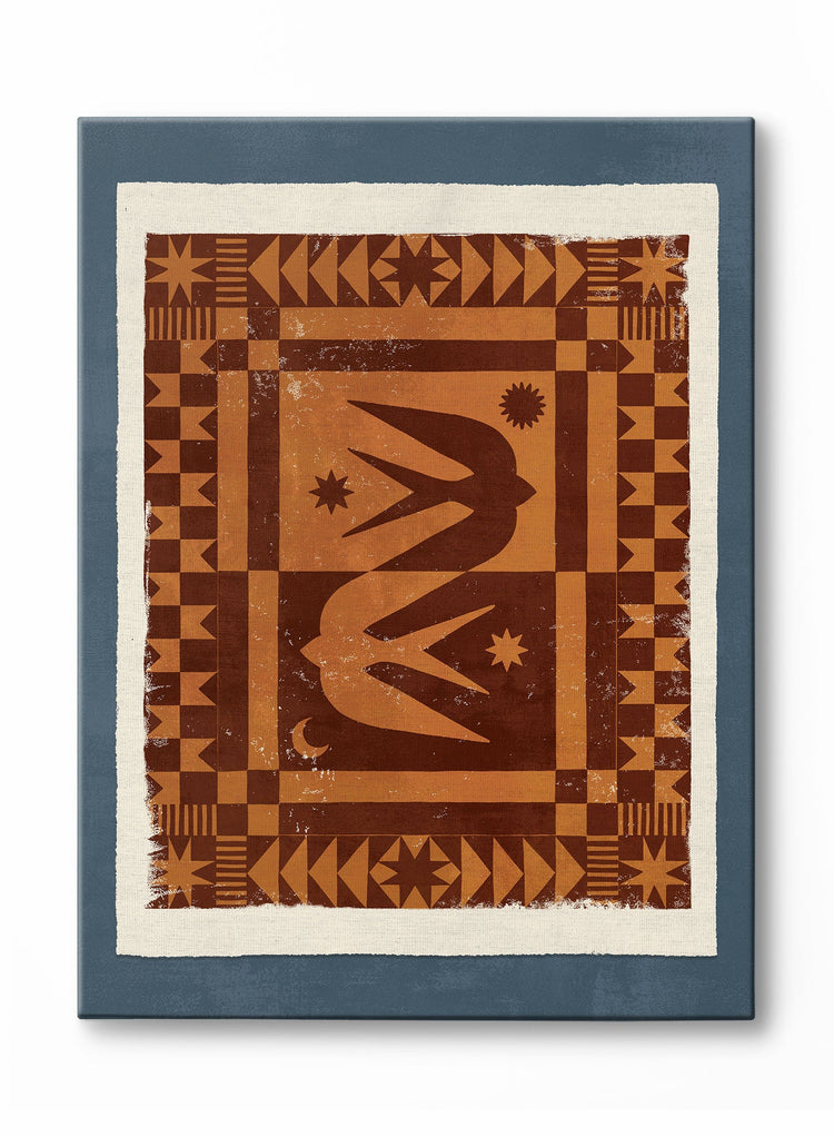 This canvas features a striking geometric design with two stylized birds at its center, surrounded by celestial motifs like stars and a crescent moon. The composition is framed by intricate patterns reminiscent of traditional quilt designs, creating a sense of symmetry and balance. The artwork's earthy tones of terracotta and deep brown are set against a muted blue background, adding depth and contrast.