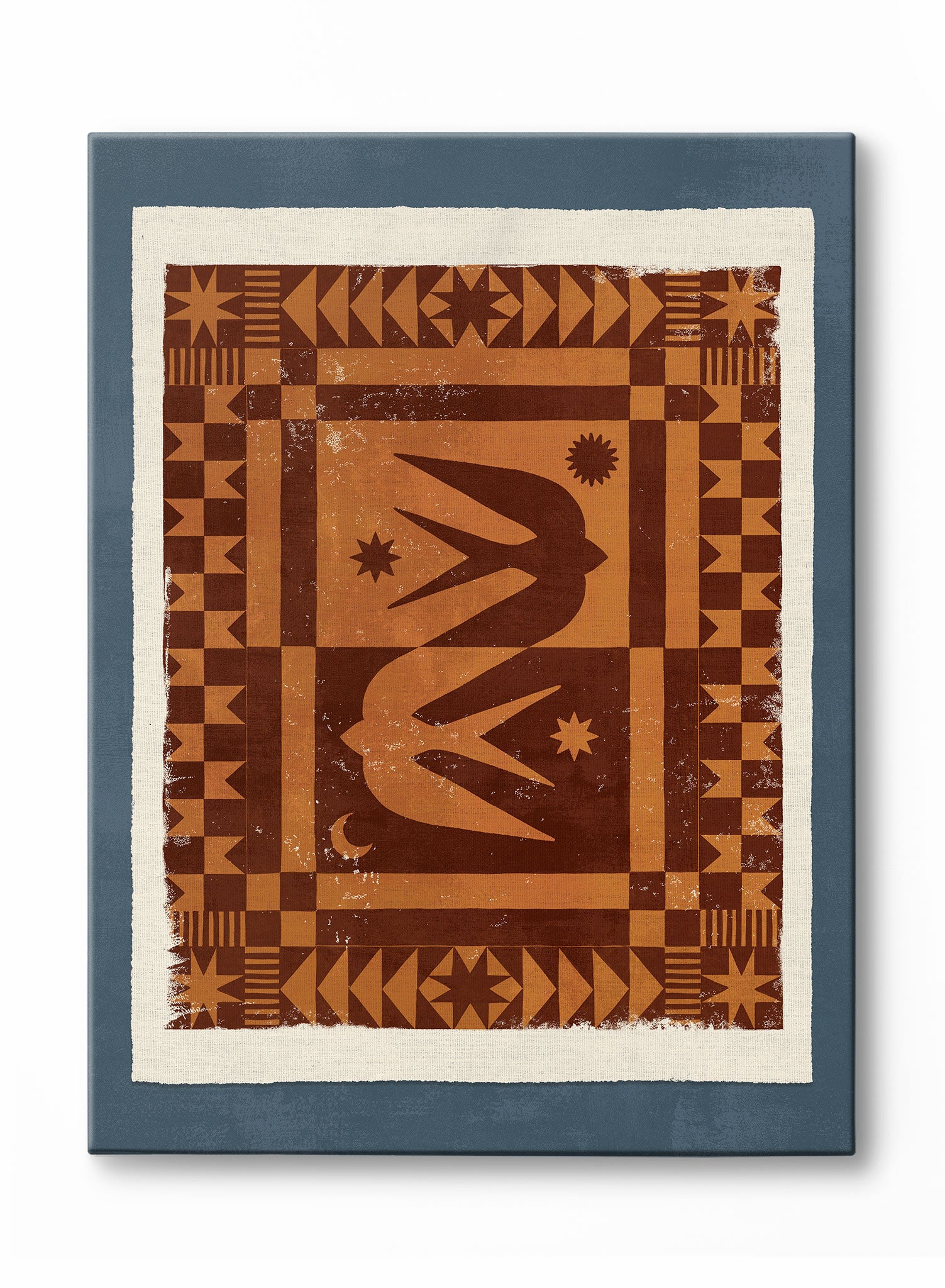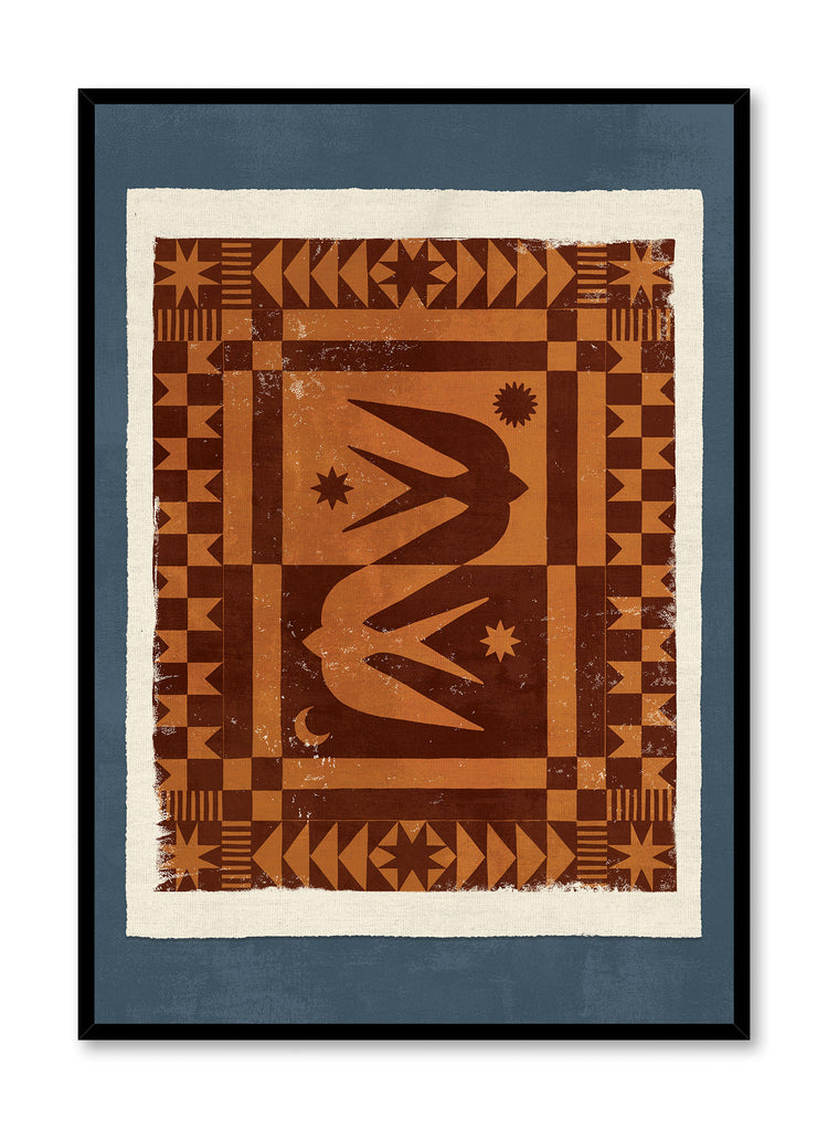 This print features a striking geometric design with two stylized birds at its center, surrounded by celestial motifs like stars and a crescent moon. The composition is framed by intricate patterns reminiscent of traditional quilt designs, creating a sense of symmetry and balance. The artwork's earthy tones of terracotta and deep brown are set against a muted blue background, adding depth and contrast.