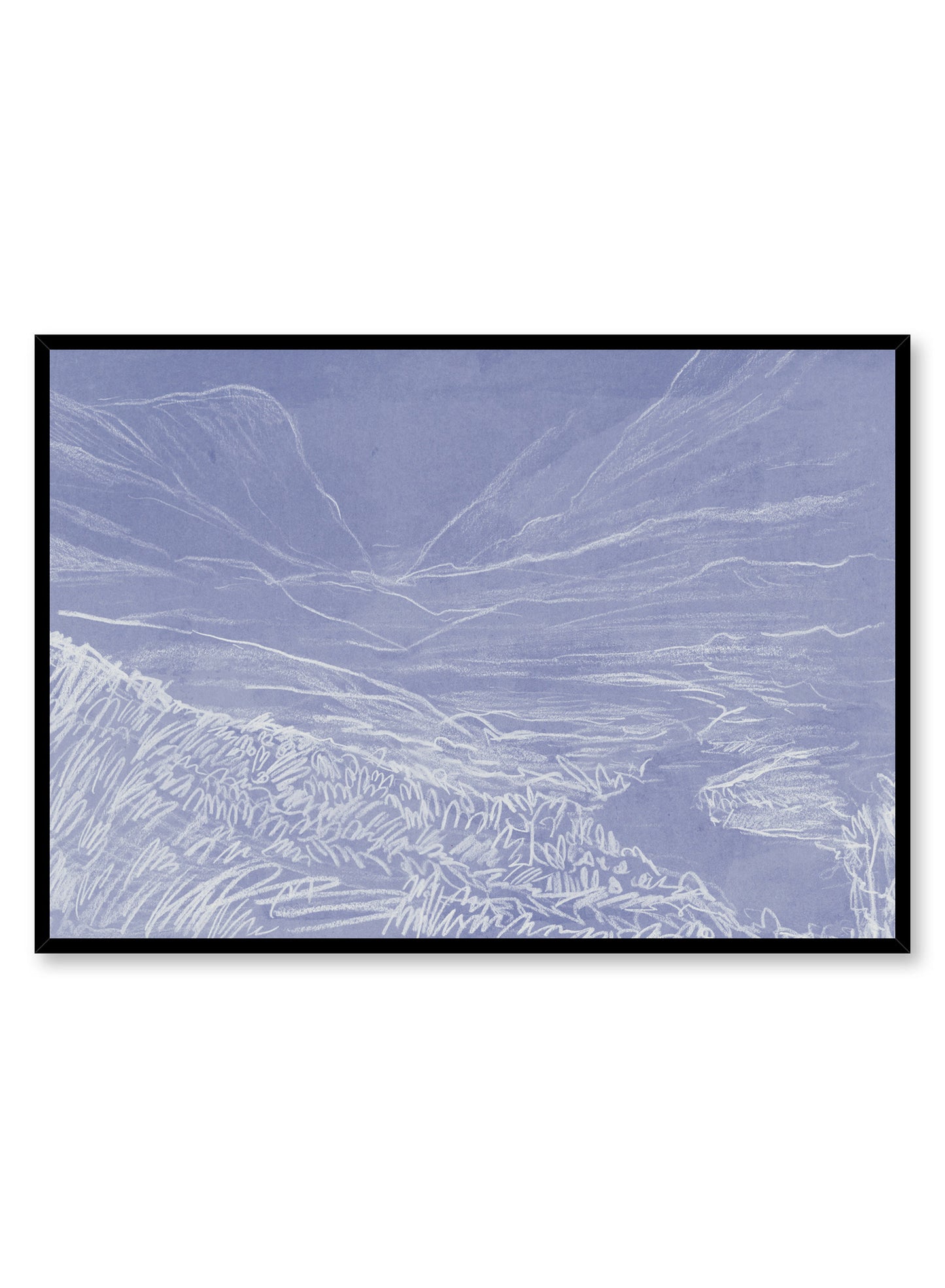 See life through lilac-colored glasses with Backcountry lilac print, a sketch of a valley surrounded by mountains. This illustration is created with a white pencil over a textured lilac background.