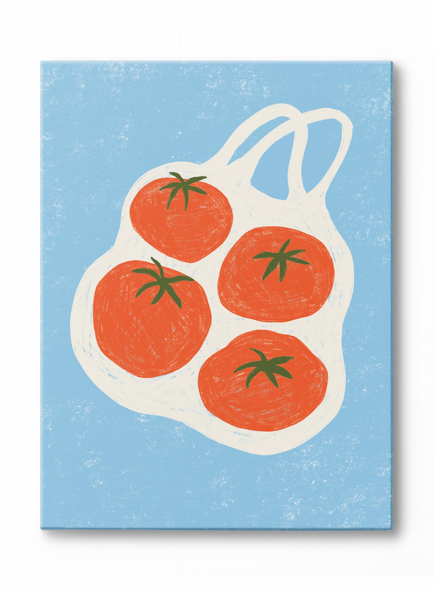 Four plump tomatoes sit snugly inside a loosely sketched market bag, creating a bold yet playful composition. The textured, crayon-like strokes give the artwork a handcrafted quality, while the vibrant red of the tomatoes contrasts beautifully against the cool blue background. The minimal linework of the bag adds a whimsical touch, evoking the feel of a quick market run on a sunny day.
