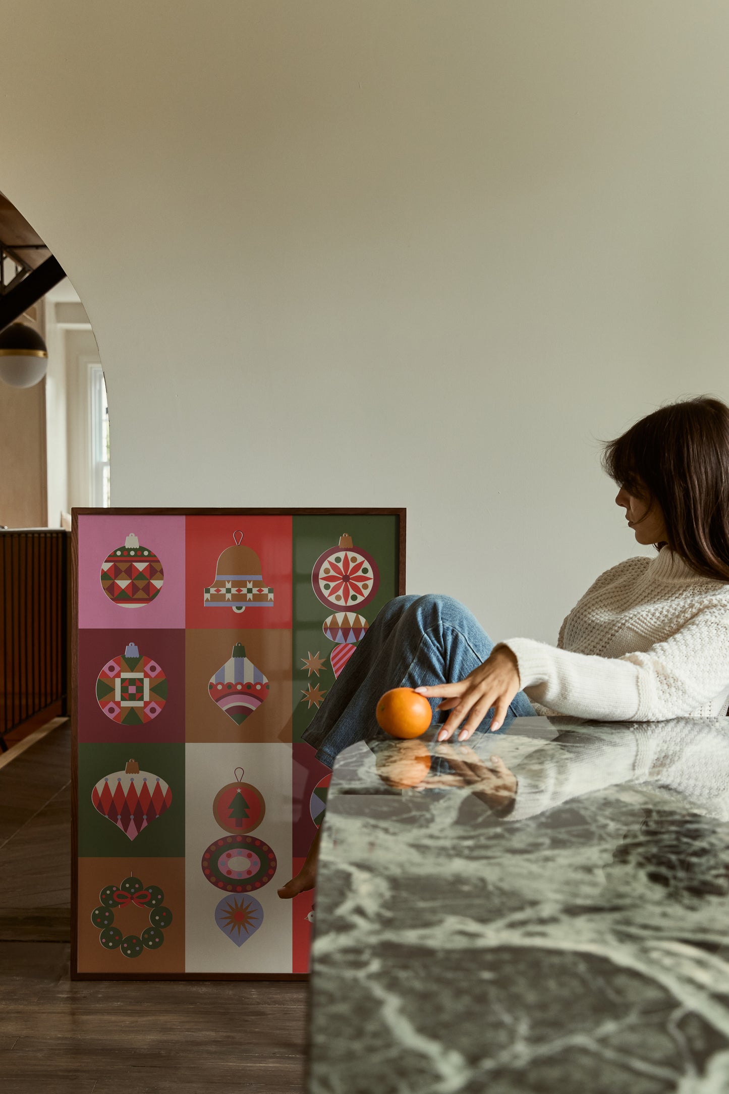 This vibrant artwork features a grid of twelve holiday ornaments, each in a different geometric design. The bold color palette of reds, greens, browns, and pinks makes for an eye-catching display. Each ornament stands out with its unique pattern and shape, from round baubles to bells and stars.