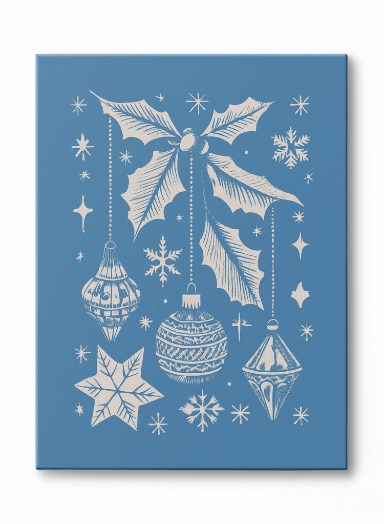 Add a touch of vintage holiday charm to your decor with this beautifully detailed canvas featuring classic ornaments and sprigs of holly. Set against a deep, wintry blue backdrop, the intricate designs of the ornaments and the delicate holly leaves evoke the magic of the holiday season. Snowflakes and stars gently scatter across the scene, enhancing the festive mood and creating a sense of quiet wonder.
