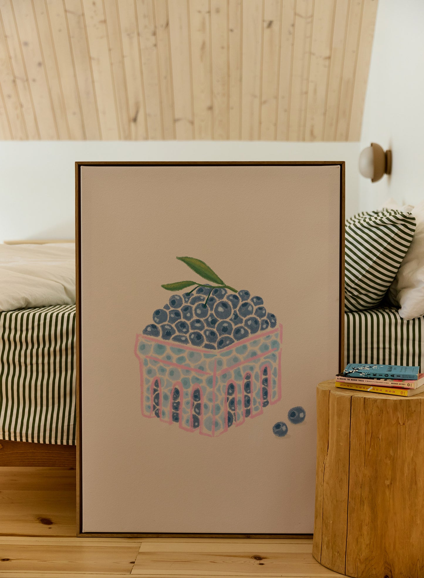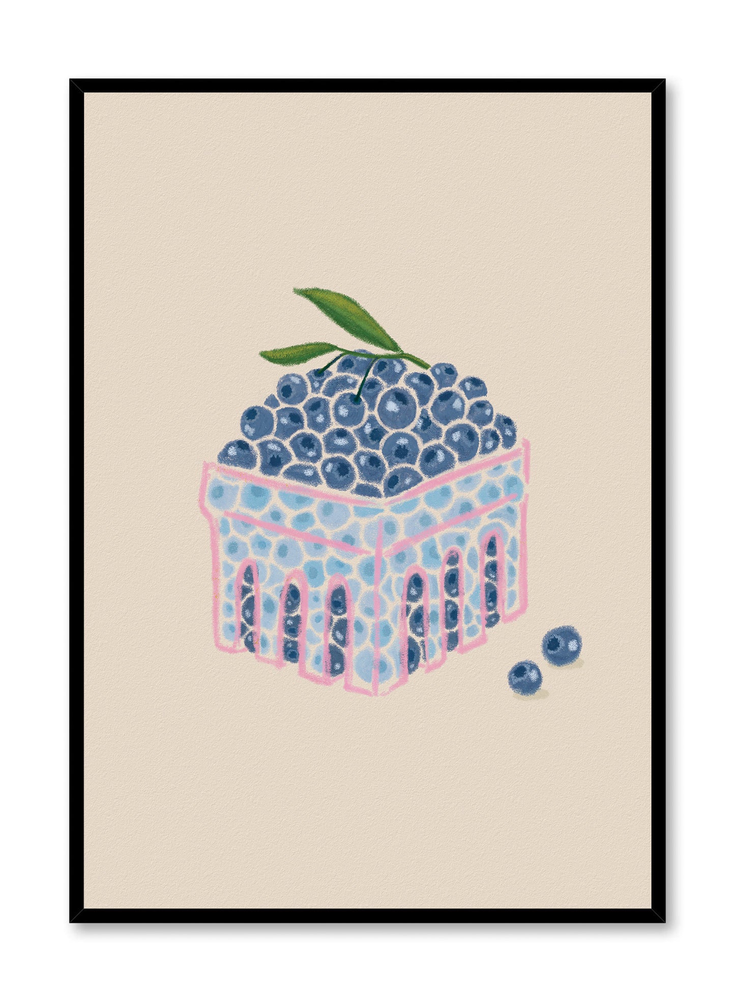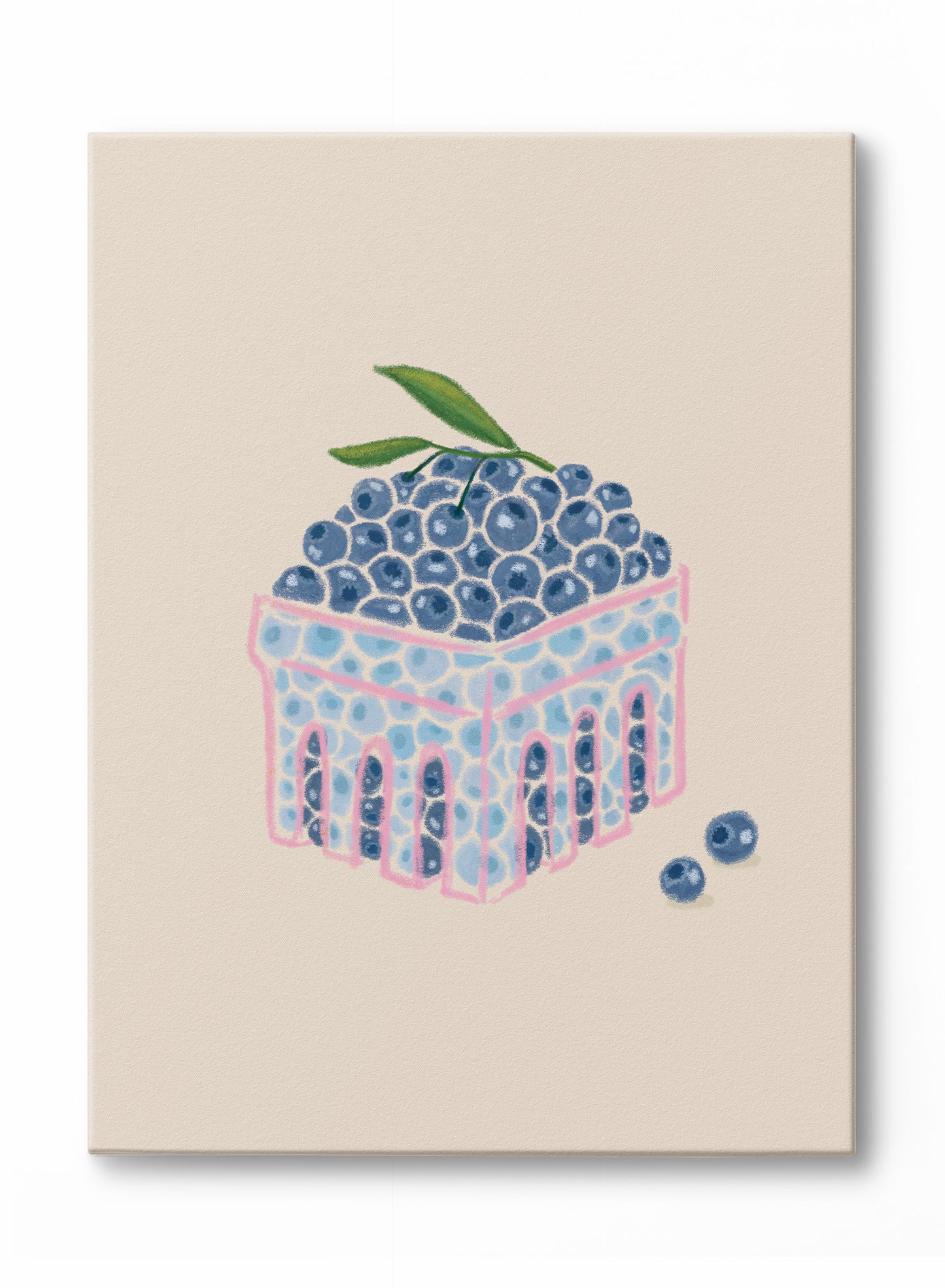 A pastel-hued basket brimming with fresh blueberries sits at the heart of this charming print. The hand-drawn texture of the berries, combined with the softly sketched container, gives it an artful, almost storybook-like appeal. A single sprig of green leaves adds a delicate contrast, completing the composition with a natural touch.