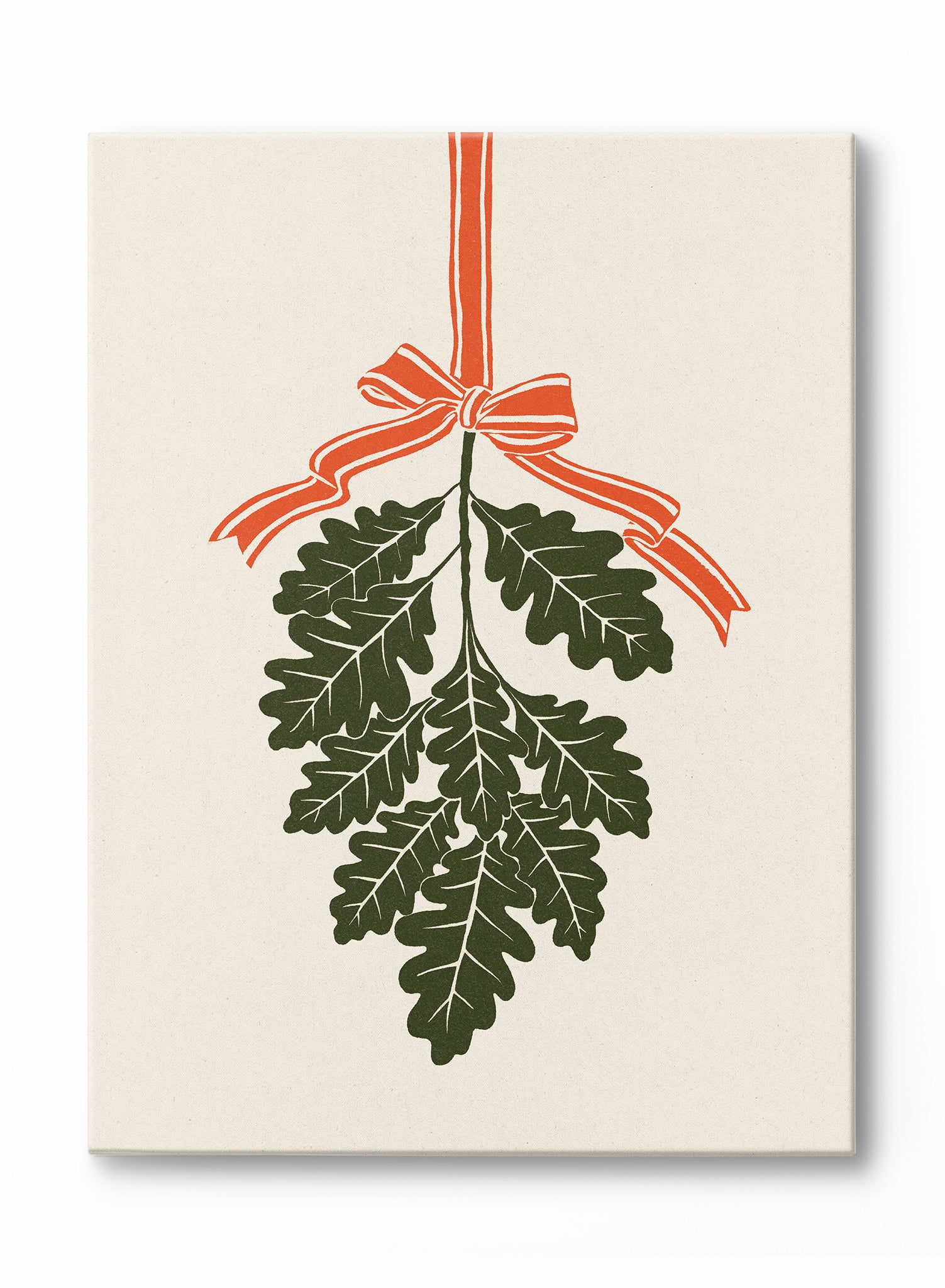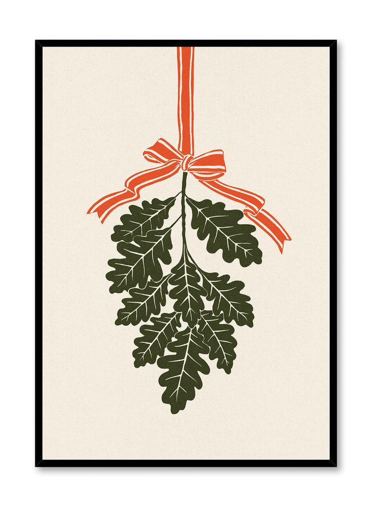 This print features a striking illustration of oak leaves tied with a bold, orange ribbon. The leaves, rendered in deep green, hang gracefully, creating a harmonious balance against the neutral background. The simplicity of the design draws attention to the intricate details of the leaves and the vibrant ribbon, offering a fresh take on traditional motifs.