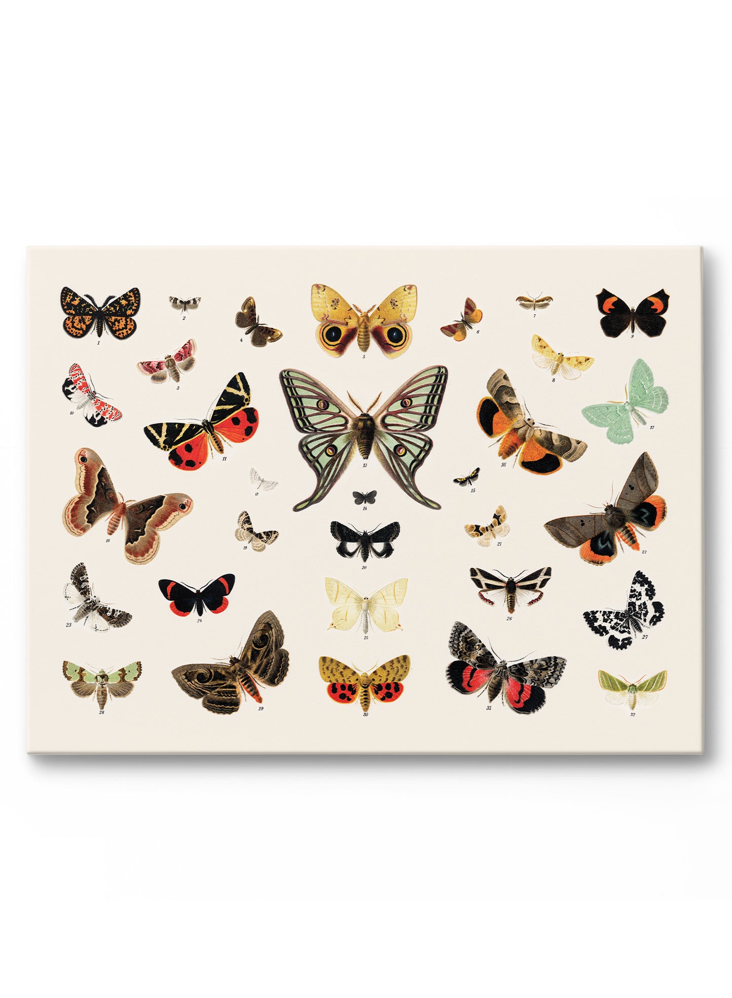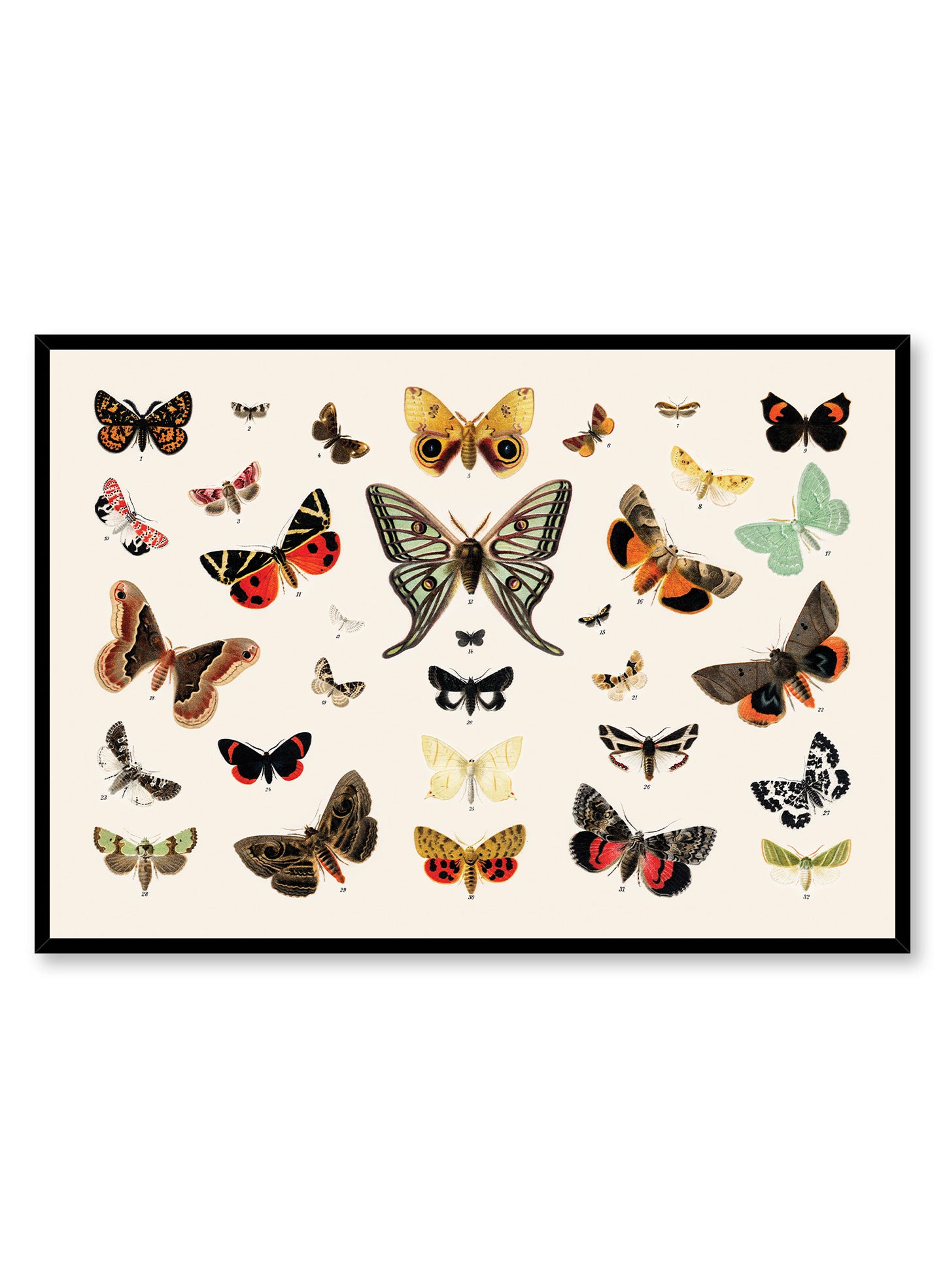 A detailed print showcasing a collection of butterflies in various colors and patterns (orange, yellow, red, green, and black) on a cream background. This scientific illustration is both beautiful and educational.