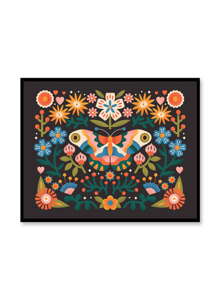 A bold burst of folklore and color, this print captures the delicate balance of nature in perfect harmony. Two mirrored butterflies, woven into a tapestry of wildflowers, create a stunning symmetrical display of movement and detail. The deep black background amplifies the warm golds, rich blues, and soft corals, making each element pop with vibrancy.