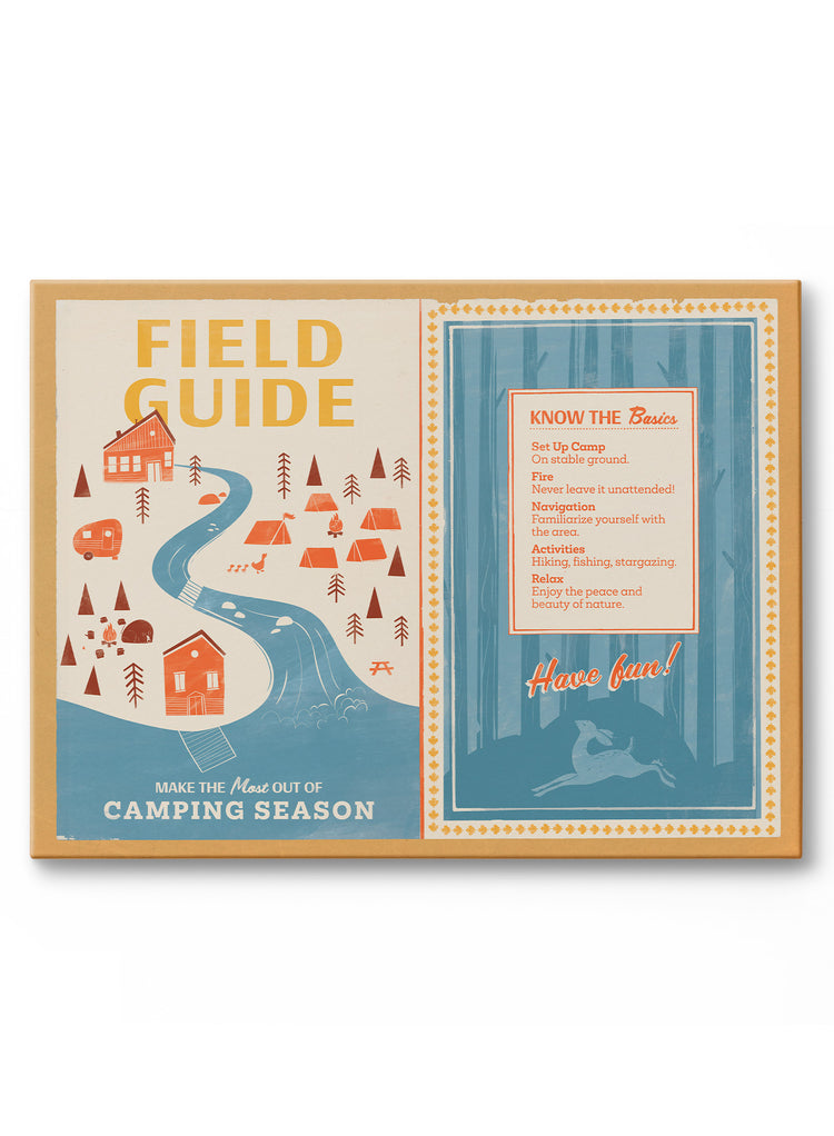 This charming canvas serves as a field guide for camping season, featuring tips and illustrated scenes of campgrounds and outdoor activities. The retro design and earthy color palette make it a delightful addition to any home.