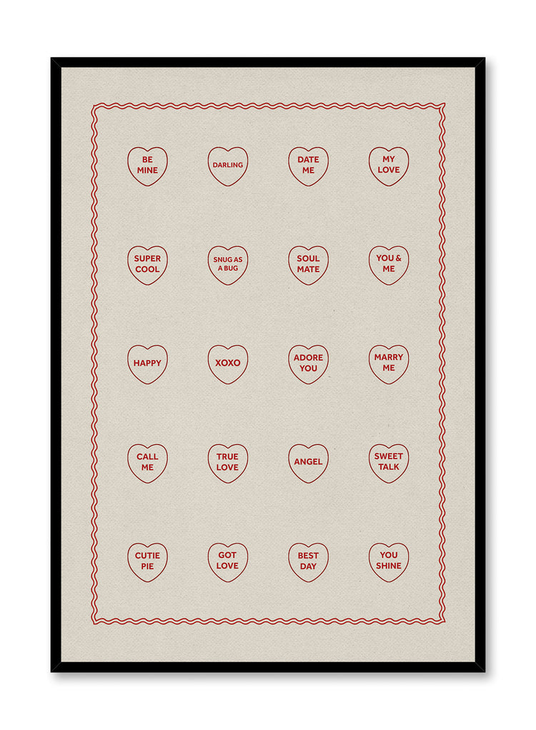 This playful and nostalgic print features a collection of red-outlined conversation hearts, each adorned with classic phrases like “Be Mine,” “True Love,” and “Sweet Talk.” Framed by a delicate, wavy border, the design evokes the charm of vintage Valentine’s Day tokens with a modern, minimalist twist.