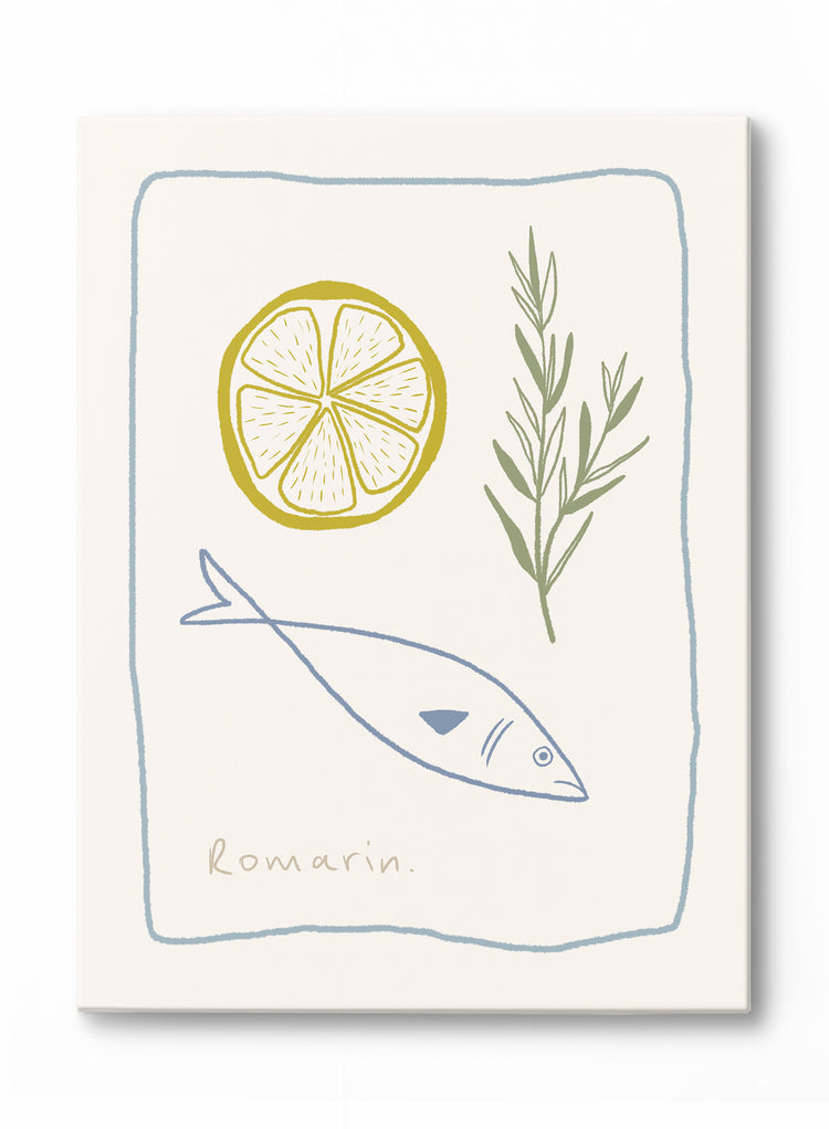‘Catch of the Day’ is dedicated to all fresh fish lovers! This minimalist canvas shows a blue fish, a yellow lemon wheel, and green rosemary sprigs with the words “romarin” in French.