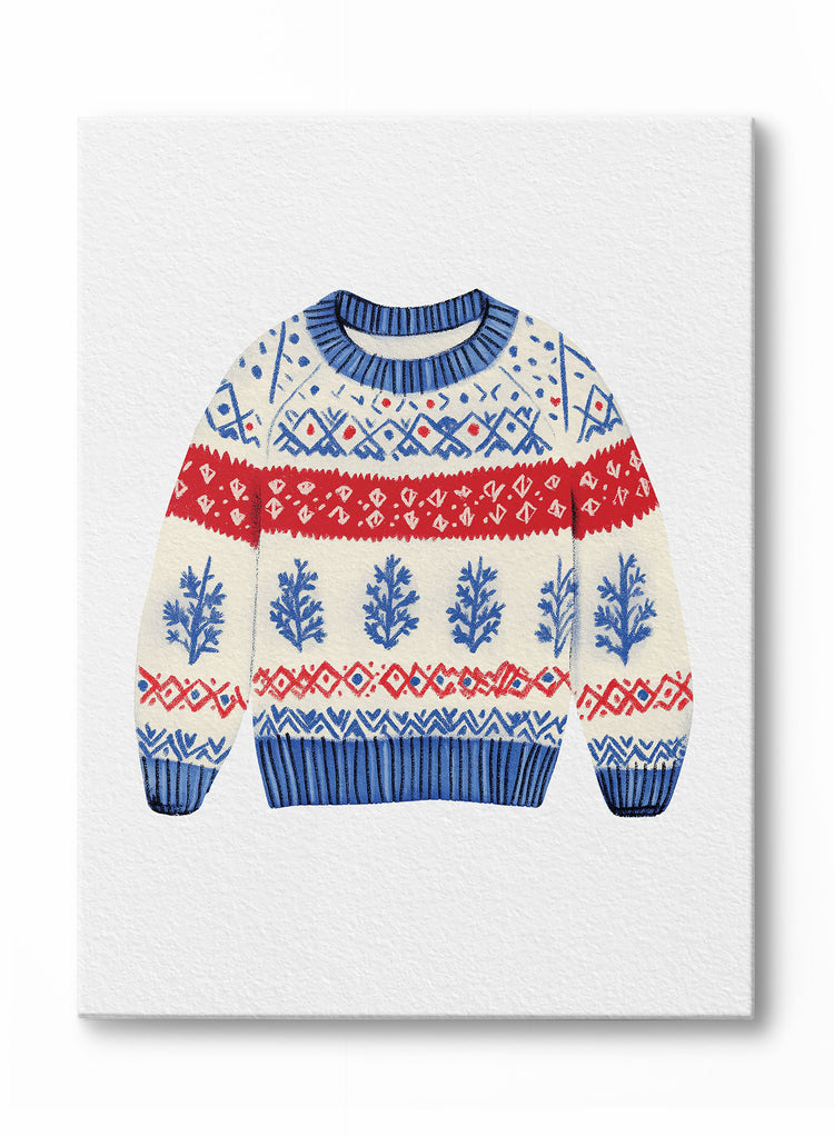 Celebrate the beauty of winter traditions with this canvas featuring a cozy Scandinavian-inspired sweater. The intricate red and blue patterns stand out against a cream background, depicting snowflakes and pine trees in a classic holiday design. The artist’s attention to the texture of the wool makes the sweater feel almost tangible, adding a sense of warmth and comfort to the piece.