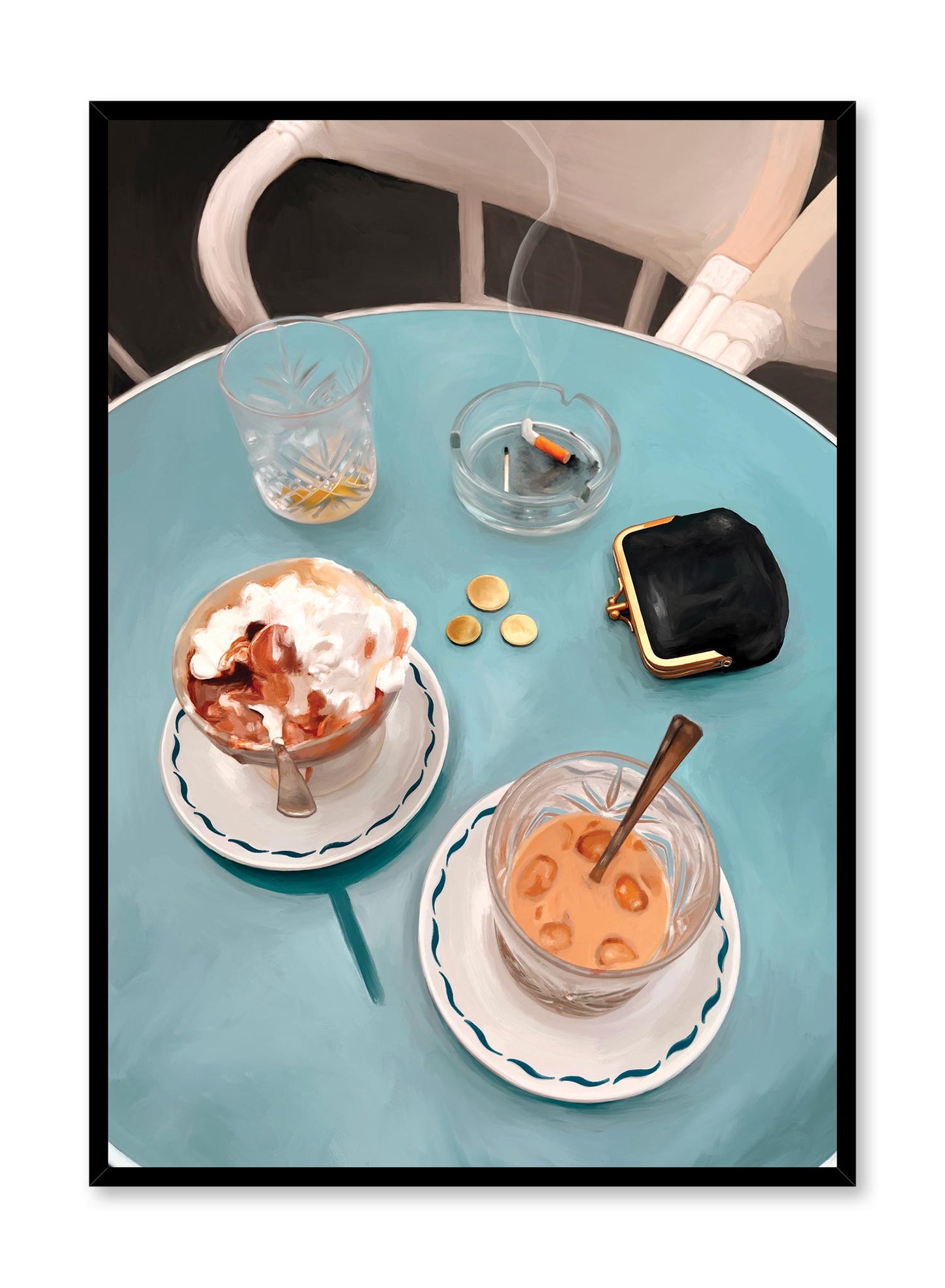 The French know how to savoir the moment. Audrey Rivet’s ‘Chit-Chat’ poster evokes peaceful afternoons sitting in a Parisian café onlooking passerby. In this quirky print, an iced coffee, a decadent dessert, an ashtray, a wallet, and glass of liquor sit atop a light blue table surrounded by vintage white chairs. This chic painting lets you borrow Audrey Rivet’s delightful Parisian aesthetic and make it part of your own decor story!