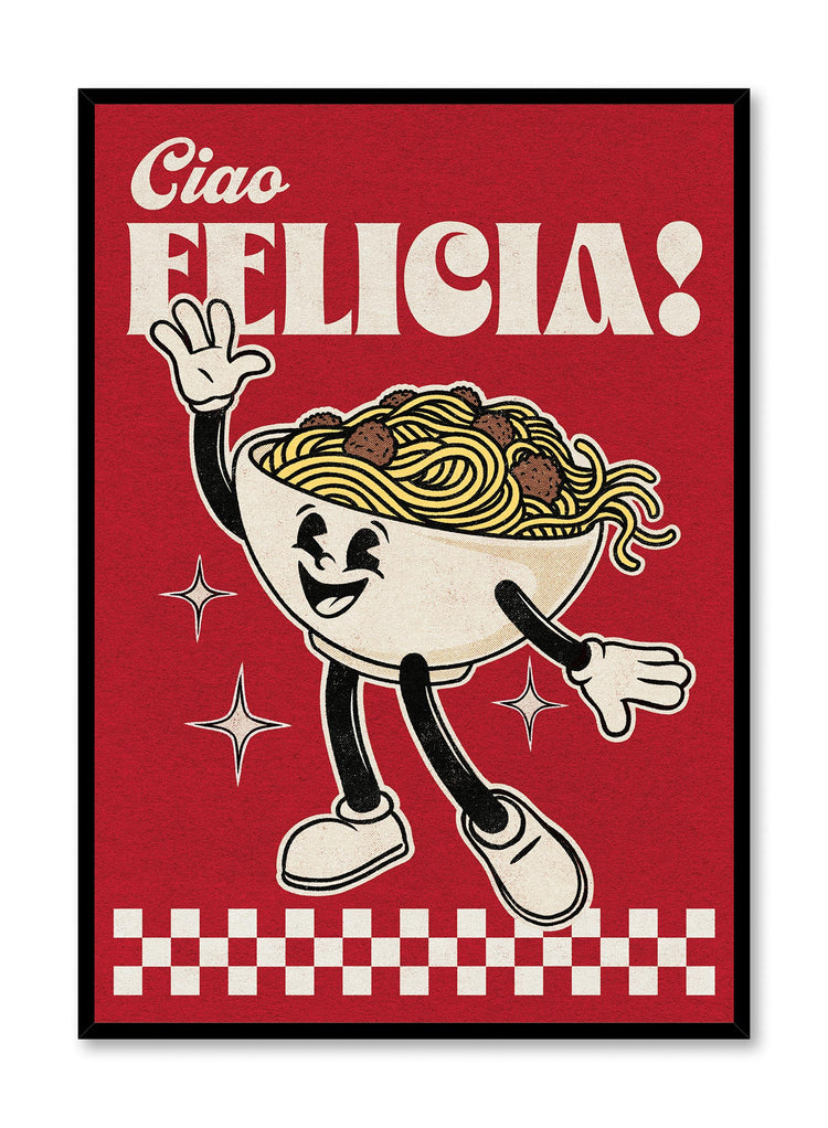 Say "Ciao Felicia!" to this charming art print featuring a vintage-style cartoon character. A cheerful bowl of spaghetti and meatballs, complete with arms, legs, and a winning smile, waves hello against a vibrant red background. The design is a playful mashup of retro animation and a modern meme, full of personality and humor.