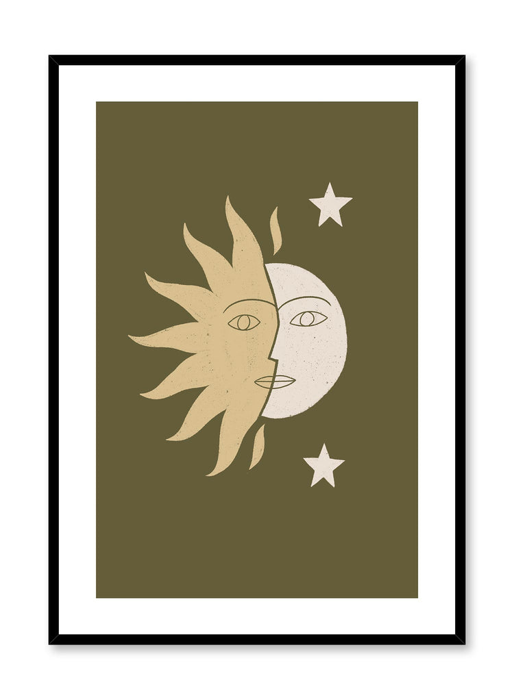 We could stare at the ‘Circadian’ poster all day and all night! This vintage-style bohemian poster has earned a special place in our hearts with its minimalist illustration of half a sun and half a moon coming together to form breathtaking astral art. An olive-green background adds depth to this print while a golden-yellow and light beige duo makes its central figure pop.