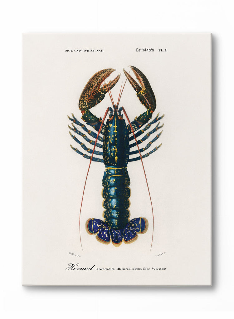 Some royals have blue blood. This king has blue scales! Give your kitchen or cottage walls an edge with this vintage illustrated canvas of a blue lobster.