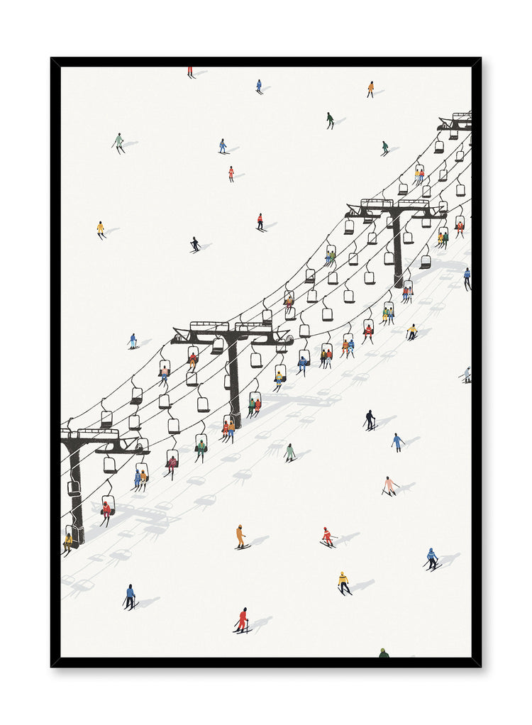Forget crowd surfing, we're all about 'Crowd Skiing'! This winter poster depicts a busy day on the ski slopes with colorful skiers riding the chairlift or gliding on the white snow.