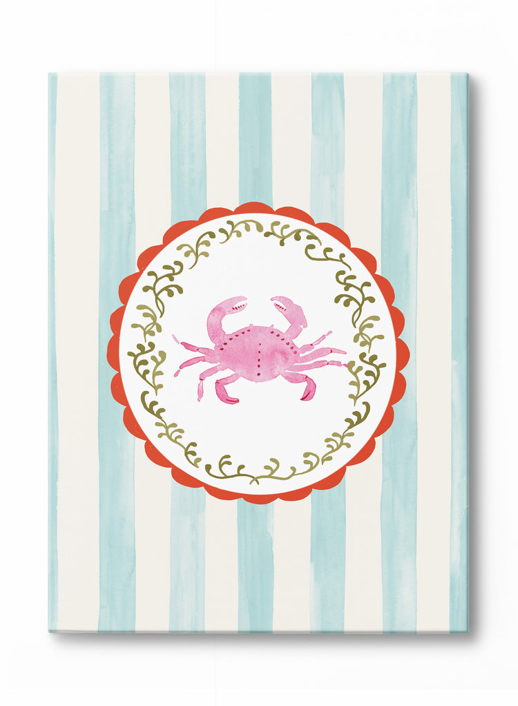 Fan of the coastal grandma trend? This one's for you! You'll love this art print of a pink crab framed by a red circular doily with a blue and white vertical striped background.