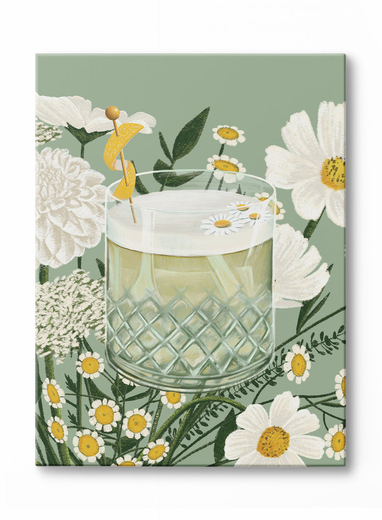 Sip on spring with this fun retro canvas of white daisies, peonies and other flowers surrounding a refreshing cocktail glass.
