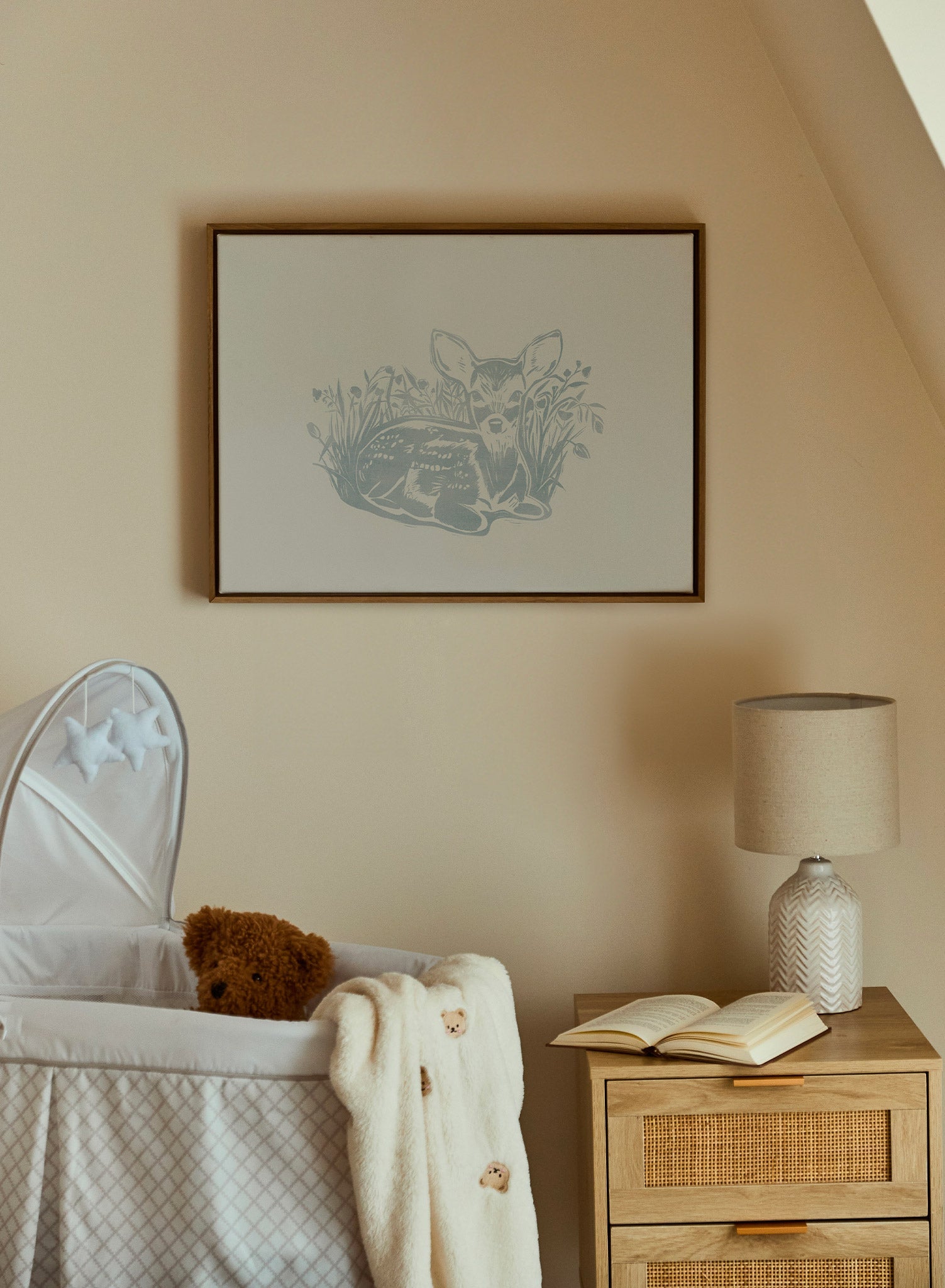 The minimalist yet expressive linework captures the innocence of the fawn and the organic charm of its floral surroundings. The muted color palette lends an understated elegance, making it a versatile piece that complements both modern and rustic interiors.