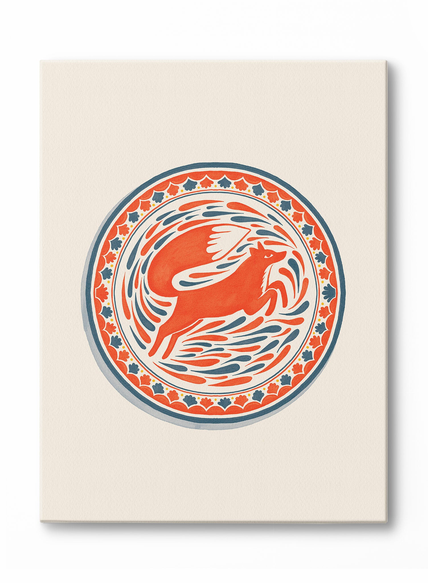 This canvas features a vibrant circular motif, centered around a stylized bird in bold red, surrounded by intricate floral patterns in shades of blue, yellow, and green. The design is reminiscent of traditional folk art, with its symmetrical arrangement and playful details, set against a soft cream background that enhances its vivid colors.
