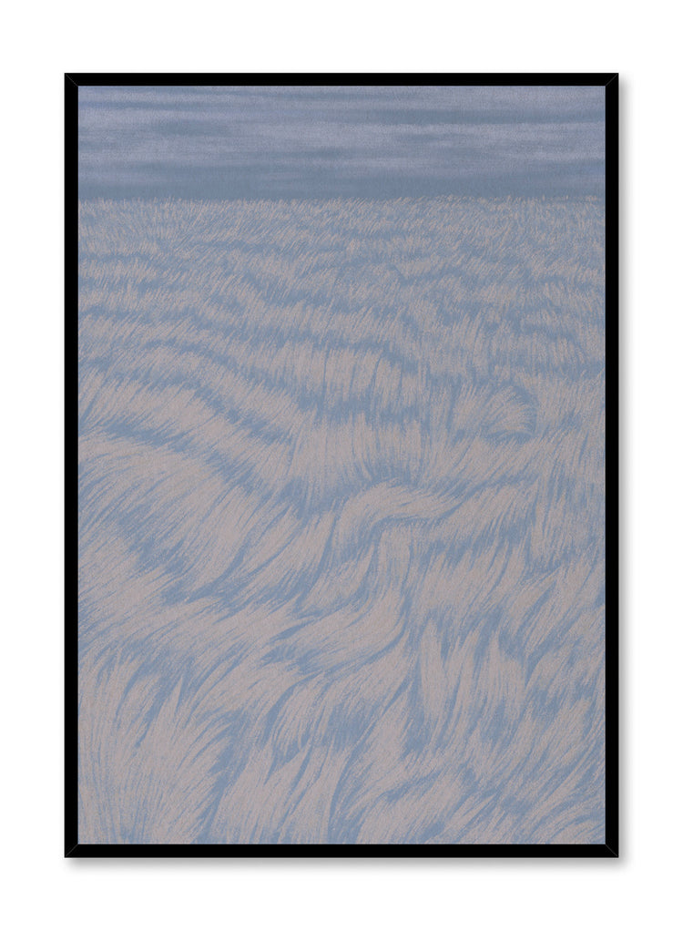Hang this dreamy print to instantly elevate your space. Just like that: Easy Breezy! This blue and beige illustration shows long prairie grass ondulating in the wind under an evening sky.