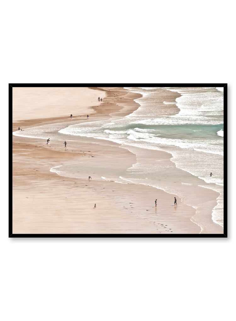 Make every day a beach day with this sublime beach photography poster of people walking along a sandy beach with low tide waves. Bring summer vibes to your decor with this ocean art print.