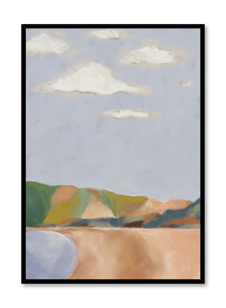 Welcome to Eldorado, where life slows down and colors come to life. This painting depicts colorful mountains and a calm lake under a cloudy sky.