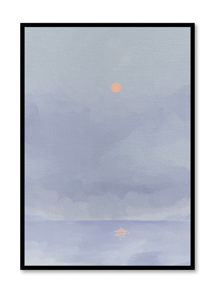 In an hectic world, remember to embrace the Essence of Stillness. This zen watercolor landscape illustrates an orange sun setting over a tranquil blue lake on a misty evening.