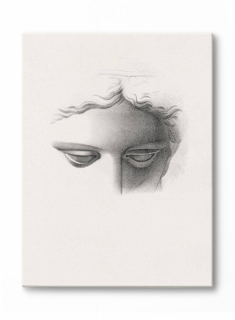 This pencil drawing on canvas portrays a classical face with great attention to detail and subtle shading. The focus is on the upper part of the face, including the eyes, which are half-closed, giving the figure a pensive, introspective expression.