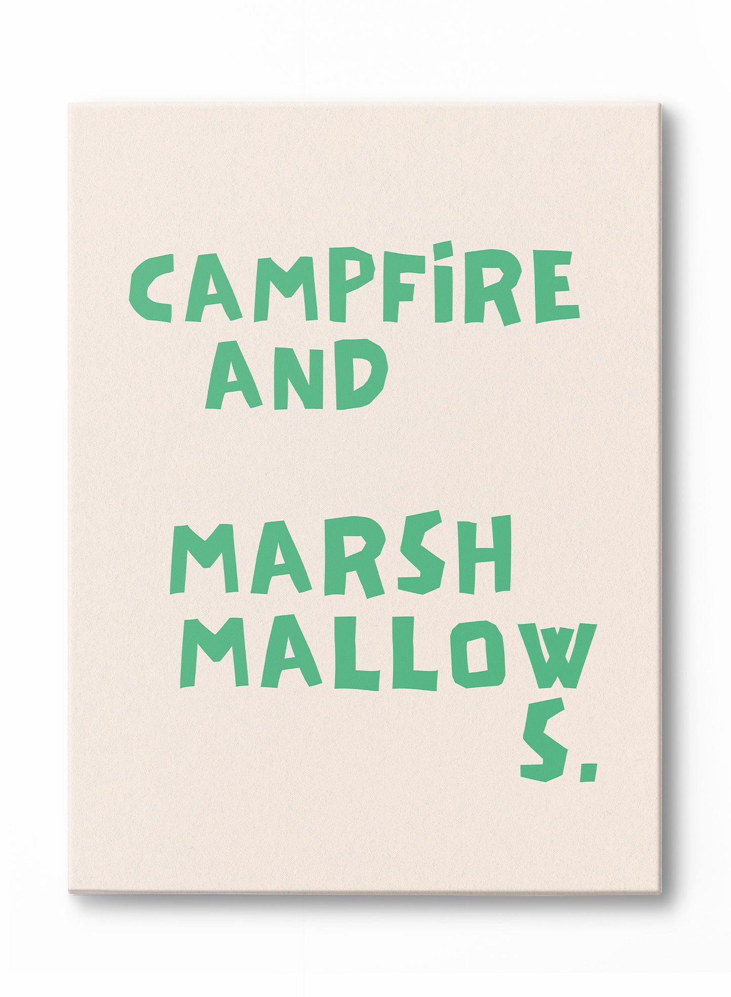 This playful canvas showcases the text 'Campfire and Marshmallows' in a whimsical green font on a creamy background. Its simple yet charming design captures the essence of camping adventures and cozy nights by the fire.
