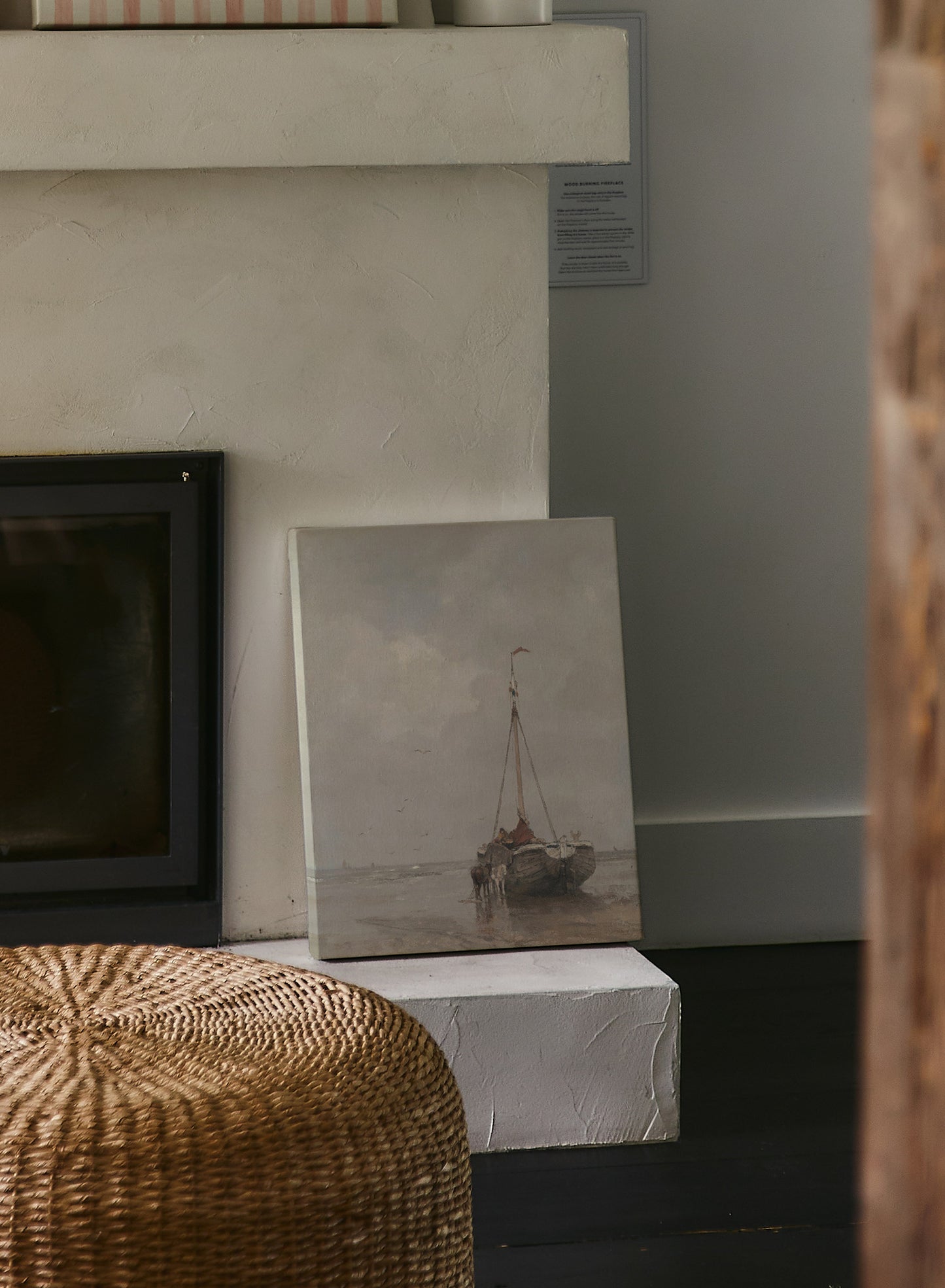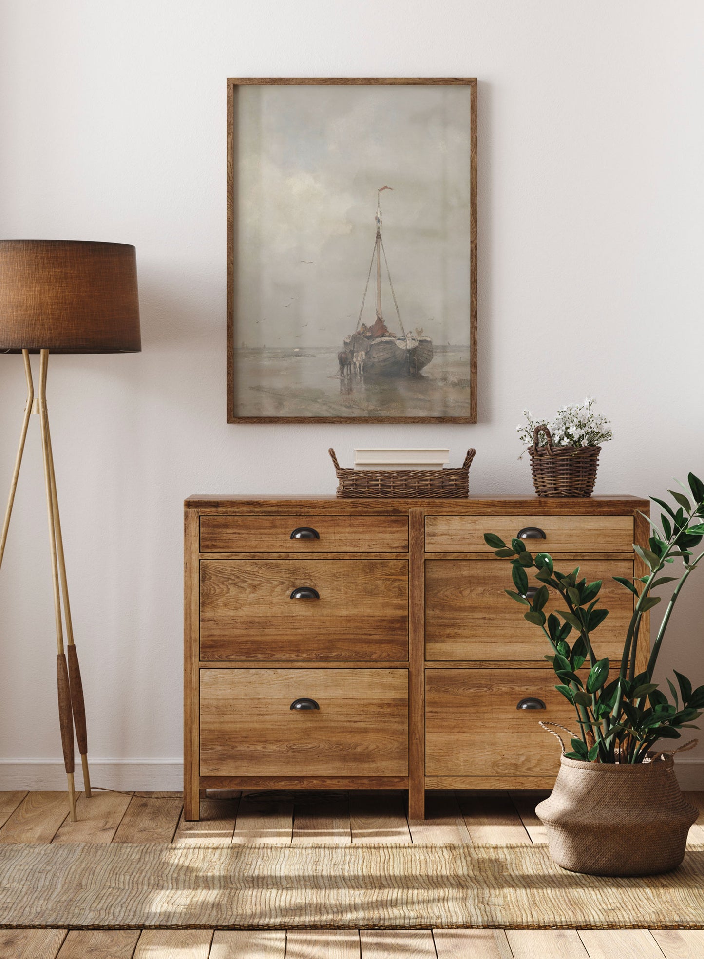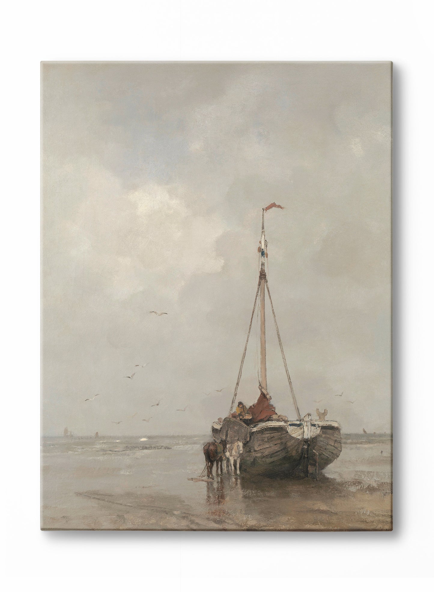 Drift away with Jacob Maris’ moody ‘Fishing Boat’ painting. This vintage art print shows a bluff-bowed fishing boat docked on a beach on a grey and cloudy day.