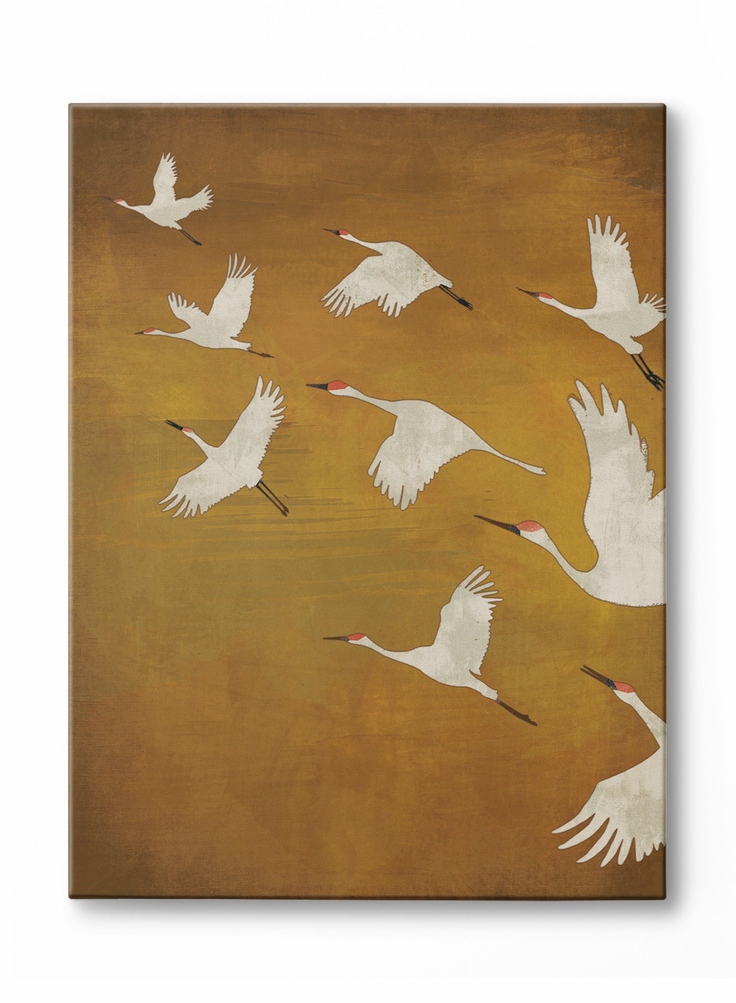 White cranes soar across a warm amber backdrop in this print, curated for Keefer House. The birds appear suspended in graceful flight, their elongated necks and outstretched wings creating flowing lines that echo calligraphic influences central to an Asian minimalism approach.