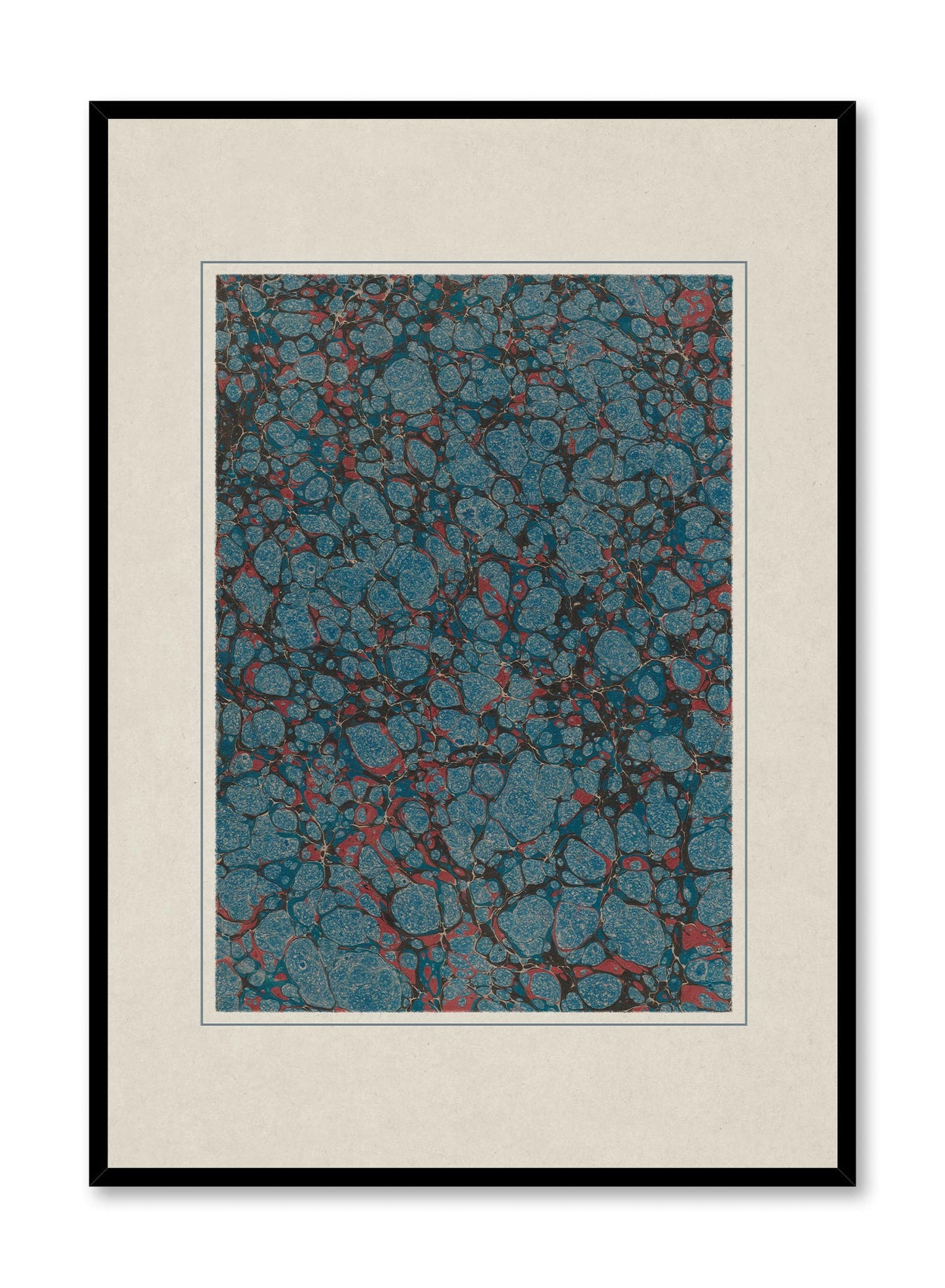 This richly detailed marbled artwork mimics the pattern of riverbed stones, with vivid cerulean and crimson tones delicately laced through a field of charcoal and steel gray. The print captures a sense of fluidity, as if the viewer is gazing into a vibrant, rippling stream.