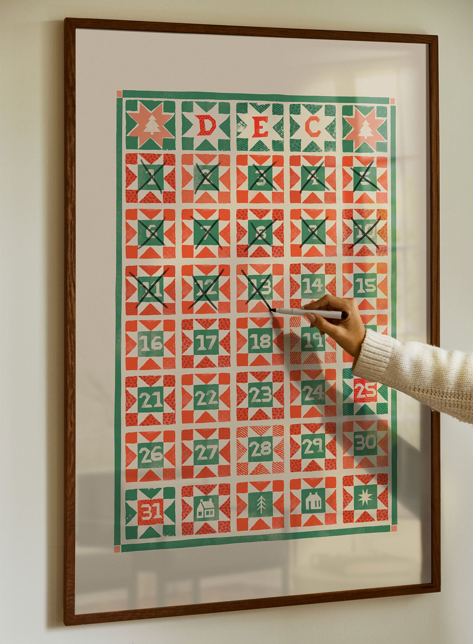 This print presents a festive calendar grid, each square adorned with geometric patterns in a harmonious blend of red, green, and cream. The top row spells out "DEC" in bold, vintage-style lettering, while numbers fill the remaining squares, leading to a star-marked 25th. The design is punctuated by charming icons like a house, tree, and snowflake, adding a playful touch to the structured layout.