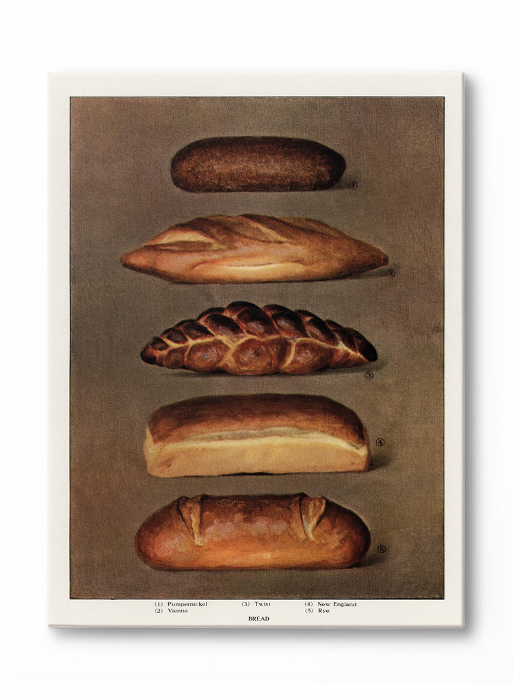 This charming still-life captures a variety of bread loaves arranged in an almost geometric pattern. Each loaf, from rustic baguettes to round pumpernickel, is painted with warm, earthy hues that evoke the comforting aroma of fresh-baked bread.