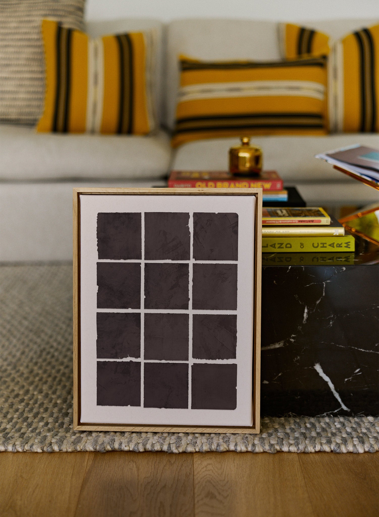 This piece works particularly well in dining rooms or home offices where its ordered composition can ground the space without competing for attention. Pair it with natural wood furniture and cream-colored textiles to highlight the warm brown tones. The grid format makes it ideal for hanging above a console table or as part of a larger gallery wall where its systematic approach can anchor more fluid pieces.