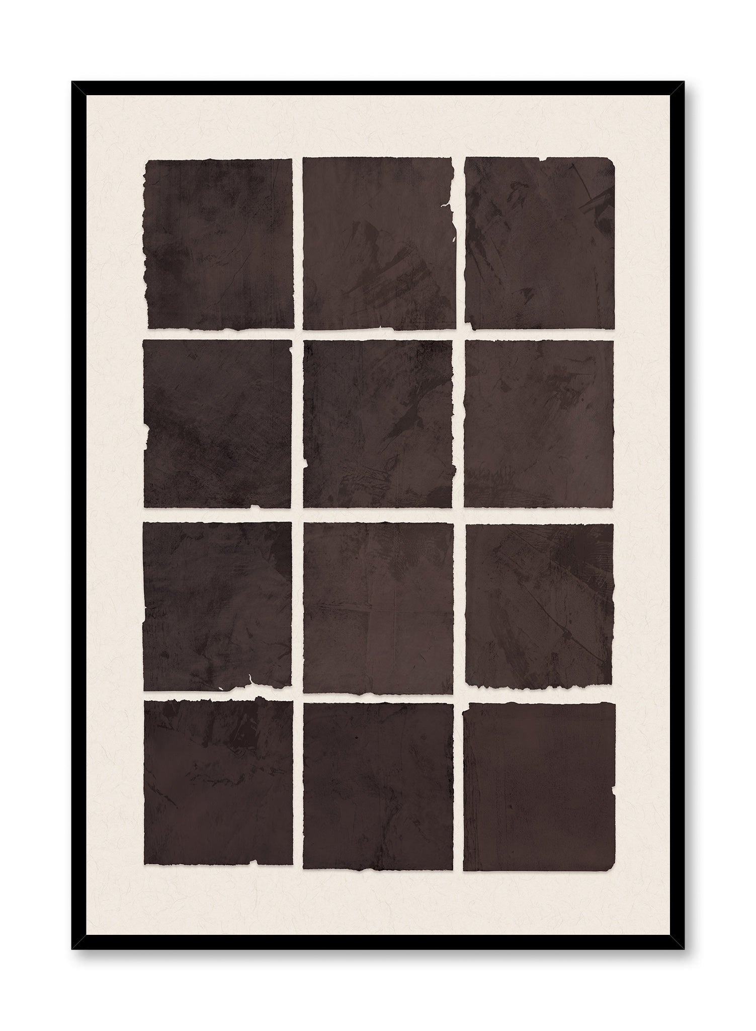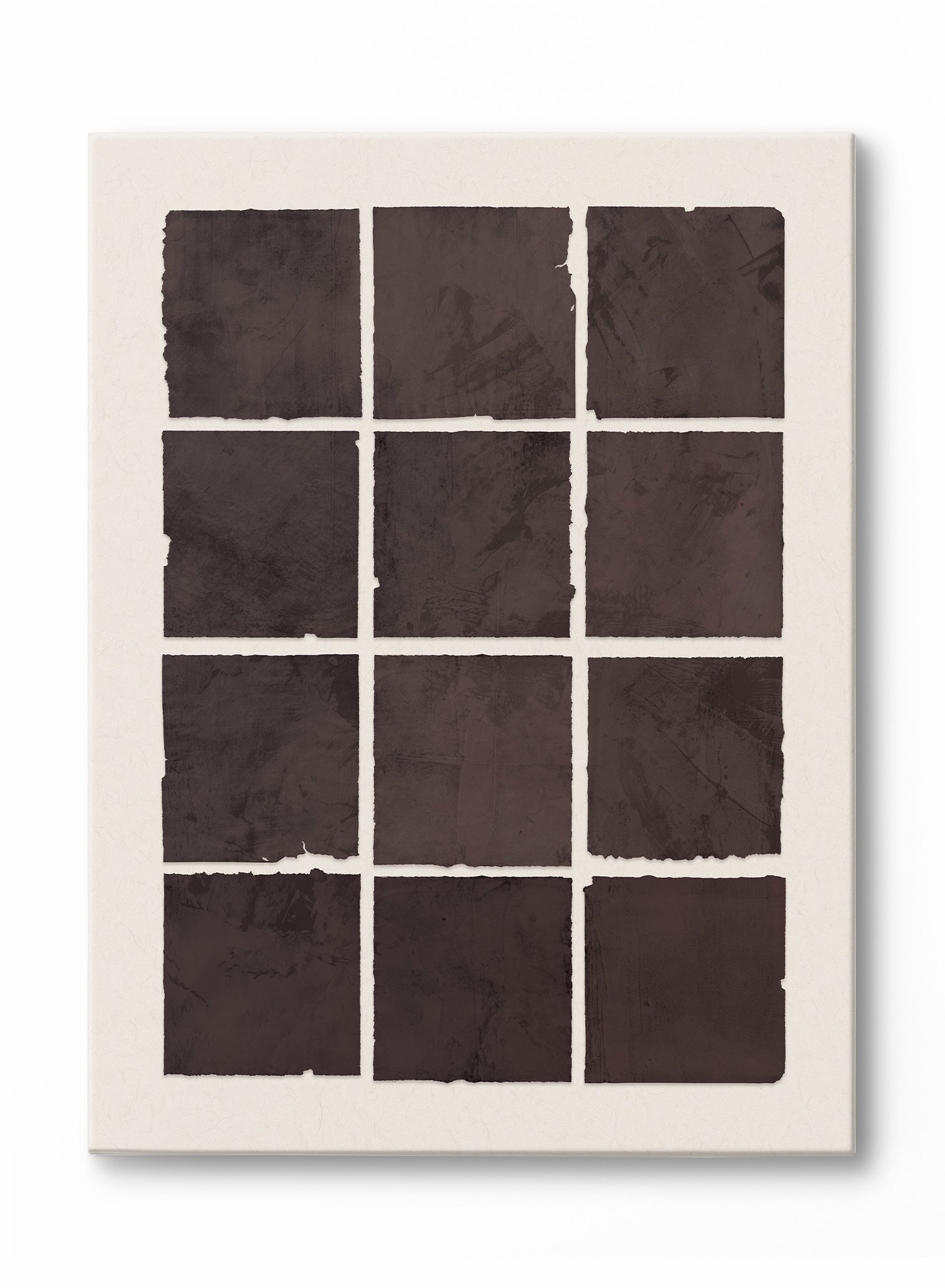 The deep chocolate hues reveal layered washes and organic surface qualities that emphasize materiality over decoration. Torn edges and weathered textures give each square a handmade quality, while the overall composition maintains the quiet restraint that defines its aesthetic philosophy. The interplay between uniform structure and individual variation captures the essence of negative space carrying meaning.