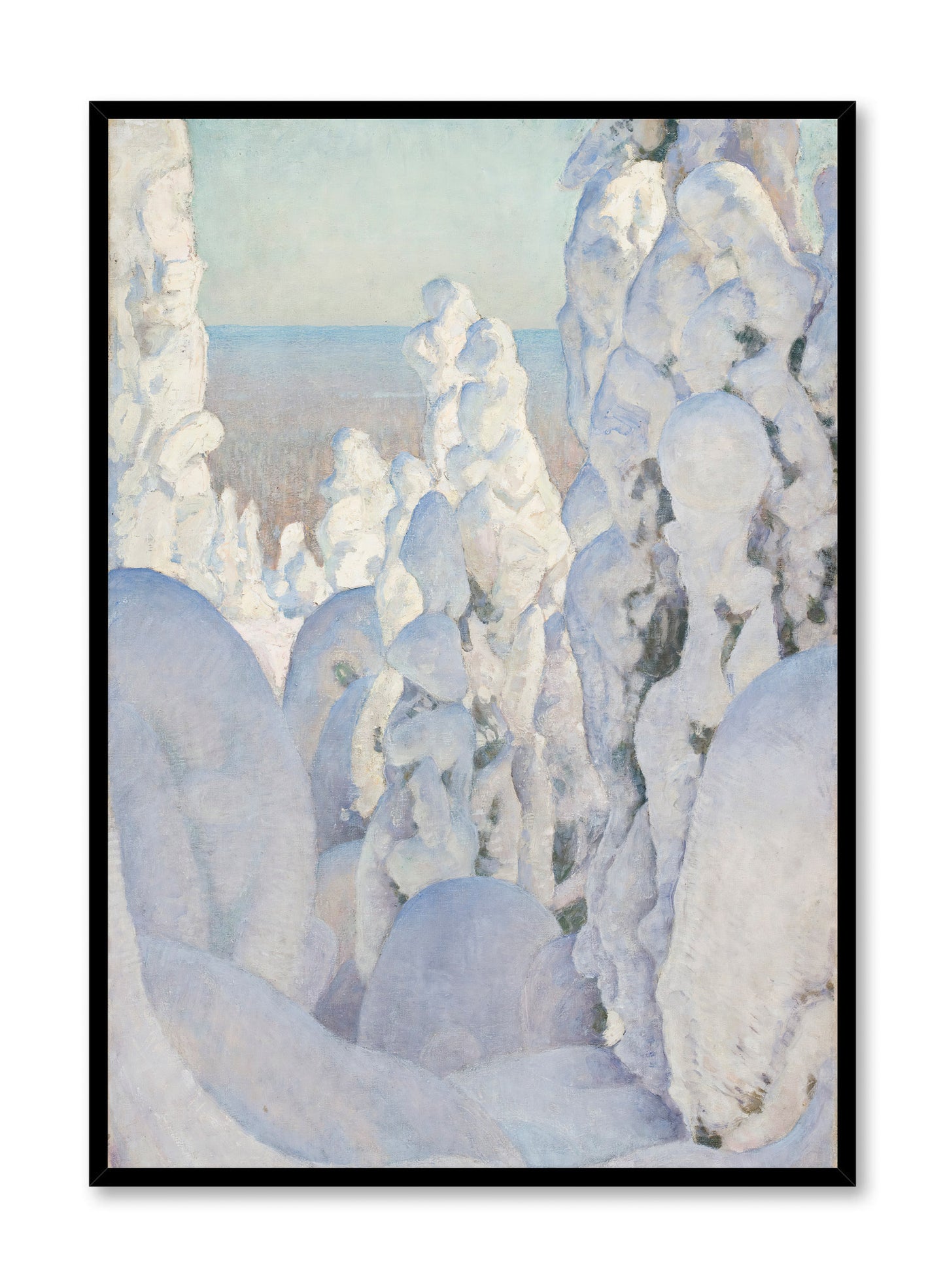 Step into a magical winter wonderland with this captivating print, where towering trees are coated in thick layers of snow. The unique shapes of the snow-laden branches create a mesmerizing and almost sculptural effect, turning the forest into a surreal landscape of icy formations. Soft blues, whites, and subtle grays make up the primary color palette, with gentle hints of pink and lavender subtly coloring the snow in the distance as the forest stretches out towards a frozen horizon.