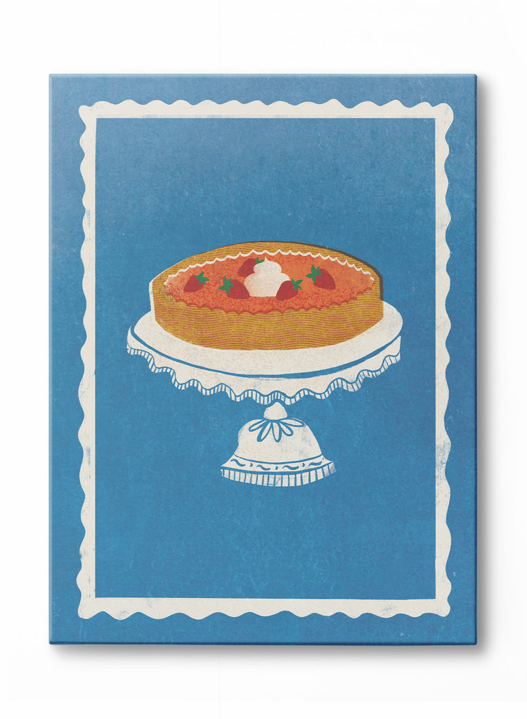 The saturated, chalky blue backdrop adds cheerful contrast and retro charm, making the warm ochres and punchy reds of the tart pop. Subtle texture gives the piece a tactile, screen-printed feel—adding visual interest without overwhelming the eye. The symmetry and flatness of form suggest mid-century illustration, yet it feels utterly fresh and graphic-forward.