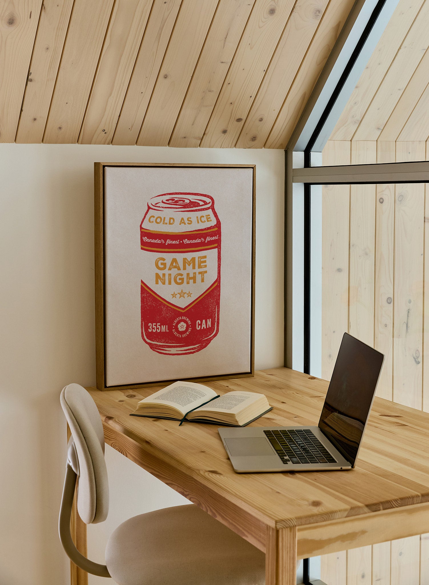 Game Night in Calgary brings the home team energy straight to your walls. A hockey-inspired beer can print that toasts to your fandom with flair. Confident, clever, and full of charm—it’s made for spaces where the cheers are loud and the love for the game runs deep. 🏒🍻