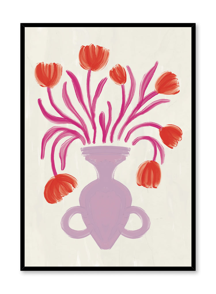 Don't settle for beige! This colorful and funky illustration is composed of a lilac purple vase and dancing pink and orange flowers.