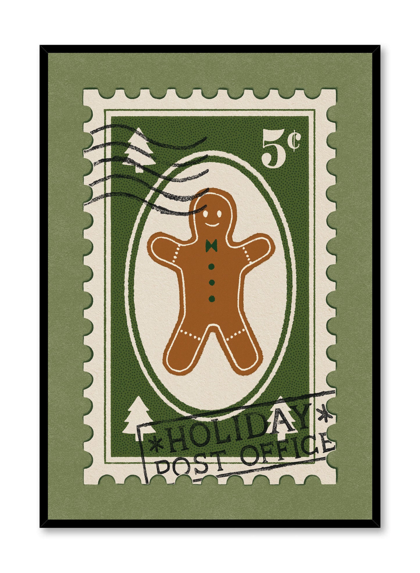 This image captures a vintage-inspired postage stamp featuring a cheerful gingerbread man, complete with icing buttons and a big smile. The deep green background of the stamp contrasts with the warm brown of the gingerbread, while delicate details like the postmark and wavy lines add authenticity to the design. The gingerbread man appears almost animated, as though he’s about to step off the canvas and into the holiday festivities.