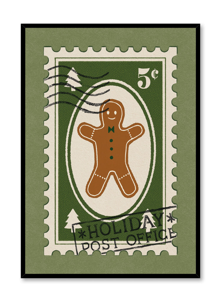 The playful nature of the gingerbread man, paired with the vintage stamp elements, creates a sense of nostalgia, bringing to mind both baking holiday treats and sending cards to loved ones. The warm, inviting tones make this piece feel cozy and festive.