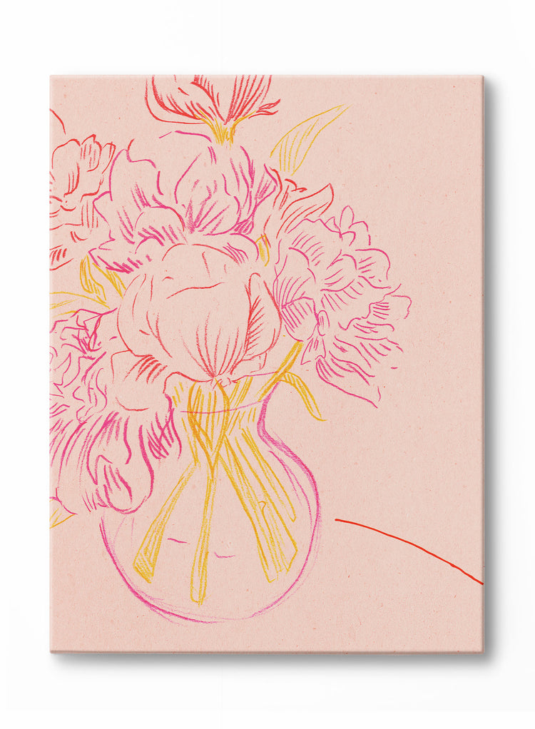 Who could resist freshly cut flowers basking in the afternoon sun? This canvas includes big pink flowers with yellow stems in a vase.