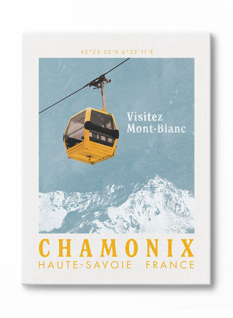 Enjoy this 'Gondola Vista' from the comfort of your home. This vintage canvas features a yellow ski gondola zipping above the snow mountains of Chamonix in the Alps.