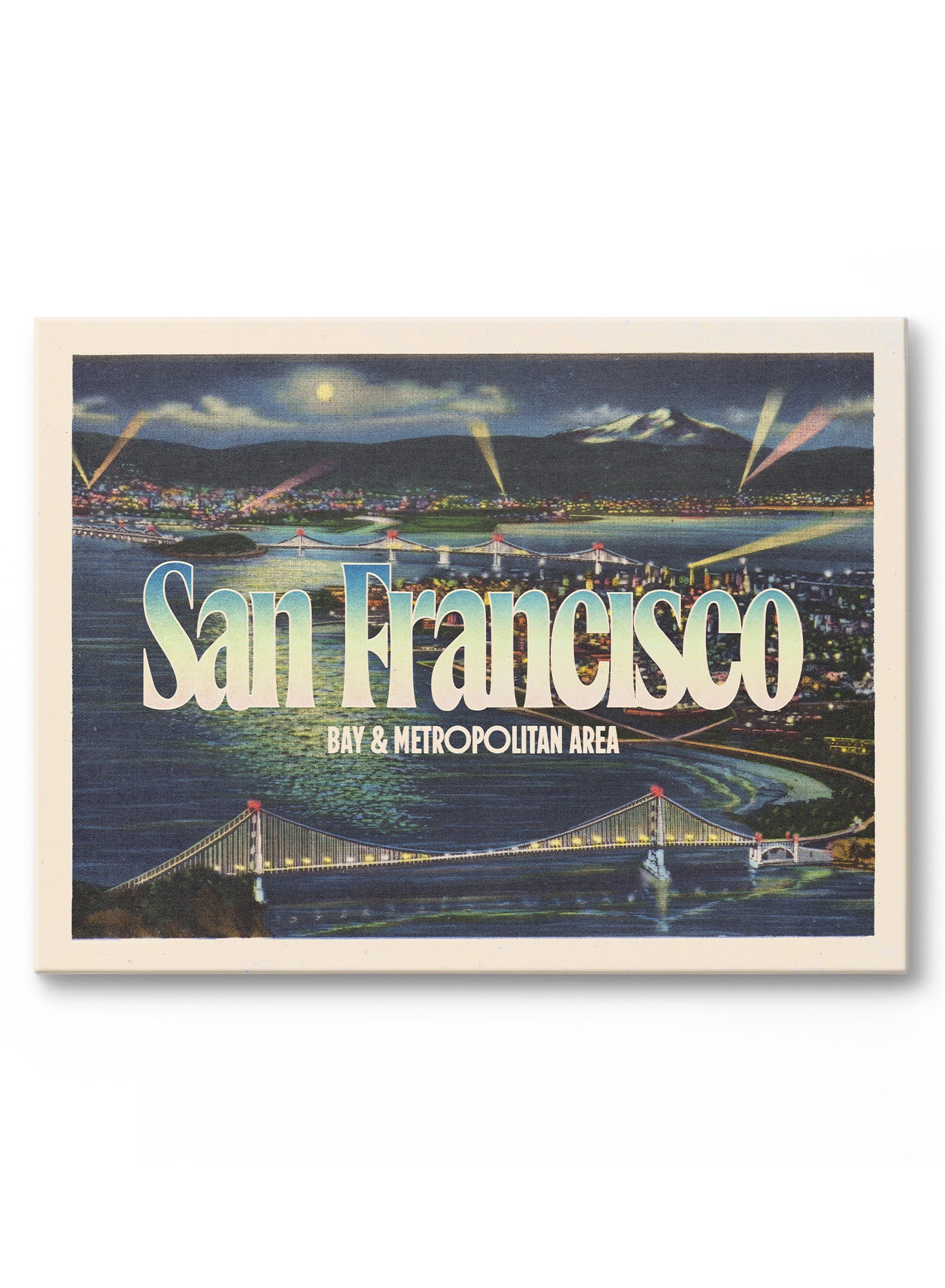 This vintage postcard-style print highlights the shimmering San Francisco Bay at night, with the Golden Gate Bridge illuminated under a full moon. The bold typography, paired with the glimmering lights of the city skyline, evokes the vibrant energy of this iconic coastal destination.